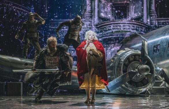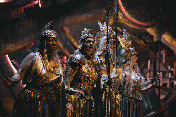 On avait déjà particulièrement goûté les magnifiques costumes de Gianluca Falaschi pour L’Or du Rhin : là encore, l’esthétique mêlant à la fois tenues de soirées chic des années trente – pour Fricka en particulier – et imagerie traditionnelle wagnérienne, façon Hans Makart, avec casques ailés et armures scintillantes, n’est pas pour nous déplaire et ne fait, surtout, jamais cheap.