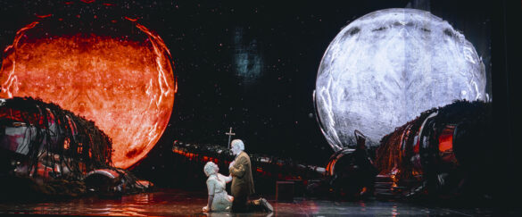 Dans cette première journée, Livermore et son équipe se sont, en outre, vraisemblablement souvenus de certains des plans cinématographiques de George Lucas pour Star Wars nous gratifiant, pour notre plus grand plaisir, d’une projection du Soleil et de la Lune, au moment où s’élève la musique du Winterstürme de Siegmund (acte I) et, lors de la scène finale, d’une vision de l’étendue galactique en direction de laquelle regarde, dos au public, la petite fille. De toute beauté. De même, le récit déjà crépusculaire de Wotan à sa fille, à l’acte II, renvoie à des projections de planètes envahies par des champs de cendres…