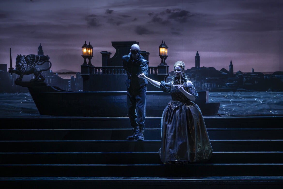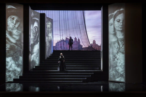 Une image de Venise illustre le prologue, en haut d’un immense escalier (décors et lumières de Laurent Castaingt) que remonte un angelot blanc, avant de laisser la place aux réjouissances du Carnaval, des personnages masqués s’animant dans de beaux costumes noirs (Françoise Raybaud). Ils seront relayés, lors de la fête chez la princesse Negroni, par des tenues rouges, afin de signifier les deux partis, du duc et des opposants de son épouse. La longue chevelure des hommes sied tout particulièrement à la distanciation temporelle mais, puisqu’il s’agit d’un être bien à part, on aurait pu choisir d’épargner Gennaro, la rondeur du visage du chanteur ne se mariant guère à ces tignasses ébouriffées. À l’acte I, c’est Ferrare qui remplace la ville des Doges, l’œil de six portraits d’homme vigilant sur les événements, signifiant sans ambiguïté la méfiance du duc. Au dernier acte, disparaissent les grandes marches, l’angelot revenant d’abord veiller sur l’assoupissement de Gennaro, enfin sur son cadavre.