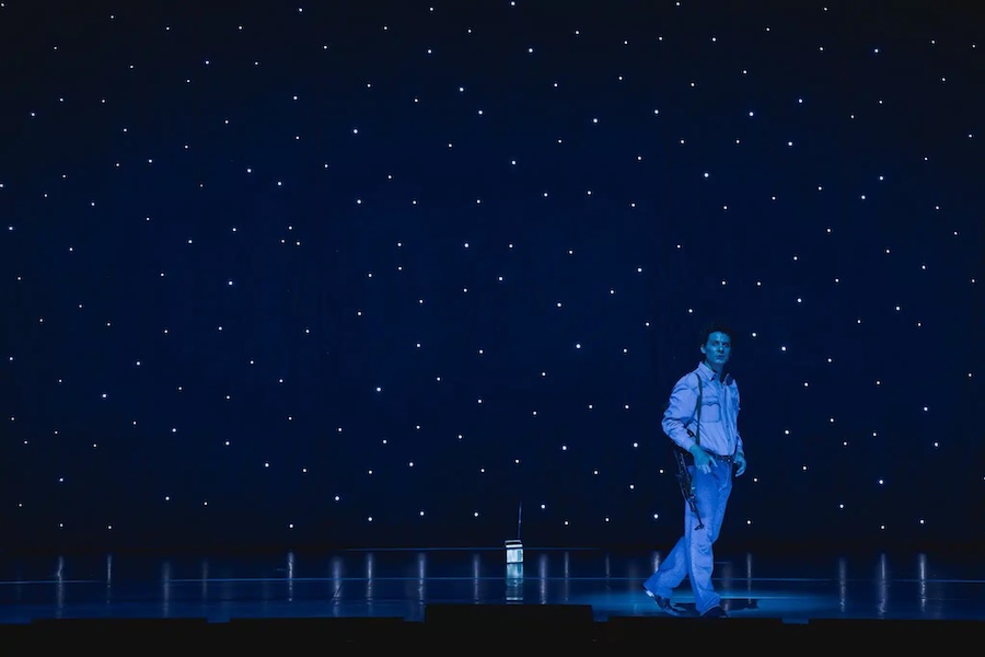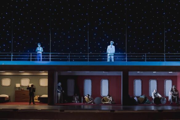 Un mélange d’éléments symboliques et réalistes structure la scénographie : passerelles et plates-formes évoquent les ponts de l’Achille Lauro ; un ciel étoilé fait allusion à une paix inaccessible ; un fond de scène accidenté rappelle inévitablement des terres martyrisées comme Gaza ou d’autres théâtres de guerre.