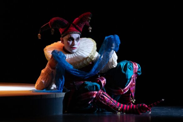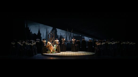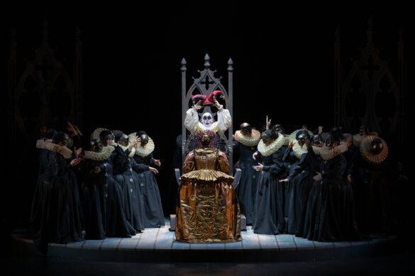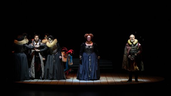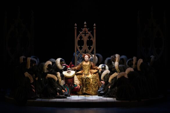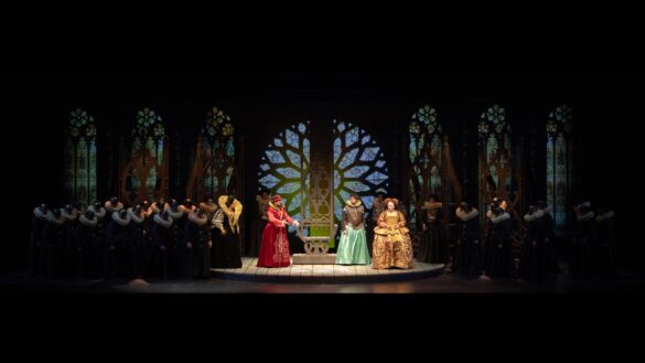 Merci, donc, aux théâtres italiens de porter haut les couleurs du théâtre de Donizetti quand – on ne le répétera jamais assez – l’indifférence des théâtres français envers ce répertoire, qui connaît une faveur énorme auprès du public, est inexplicable. Merci à la mise en scène d’Alfonso Antoniozzi pour sa lecture simple de la pièce. Cette production, créée en 2016 au Carlo Felice de Gênes, a été reprise avec succès au Regio de Parme puis à Bologne, où l’œuvre n’avait pas été reprise depuis 1992 (direction Gavazzeni, mise en scène Zuffi). L’action est racontée de façon linéaire, dans un décor épuré se réduisant le plus souvent à un plateau noir où les riches costumes d’époque (Gianluca Falaschi) ressortent. Cette approche rappelle l’art de Jean Vilar. Aux côtés de la reine paraît un fou qui fait des cabrioles sur le trône. Qui est-il ? que signifie-t-il ? S’agit-il du successeur, Jacques VI d’Écosse ? S’agit-il de la fin de l’ancienne Angleterre, comme semble le suggérer le tableau final ? On ne le saura pas. Le chœur est masqué, hommes et femmes portant le même costume, car Antoniozzi considère que, à l’époque élisabéthaine, tous jouaient un rôle. Visuellement, la scénographie de Monica Manganelli et les lumières de Paolo Liaci sont agréables. Il n’y a pas de vidéo, ce qui est original de nos jours. Quelques meubles en style gothique suffisent à restituer une époque. Le résultat est éloquent.