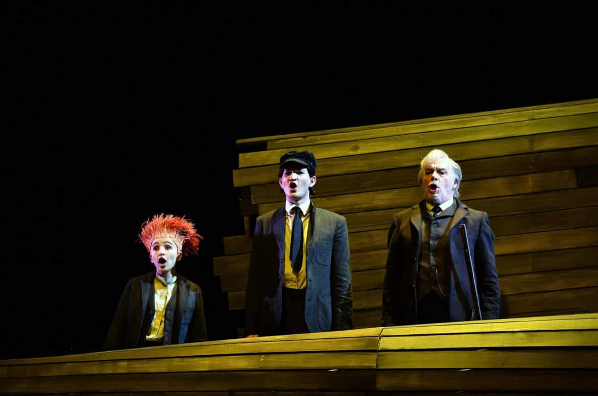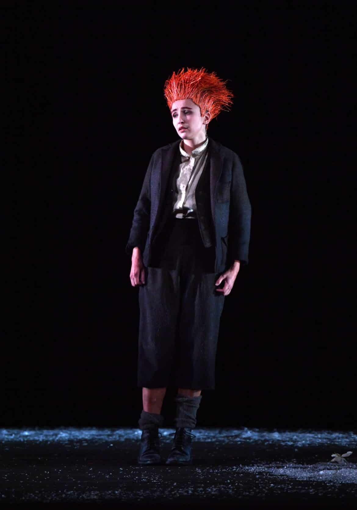 L’absence de virtuosité vocale est un marqueur du conte qui vise le « tout public ». Pour incarner Poil de Carotte, le choix d’une soprano ne surprend pas, emboitant le pas d’une longue tradition lyrique depuis le jeune Cherubino jusqu’à Fantasio. Amélie Tatti incarne avec un brio juvénile le jeune rouquin, autant à l’aise pour chanter suspendue dans les airs (Mathilde) que pour haranguer ses seuls confidents, clones rouquins (chœur d’enfants). Qu’elle soit espiègle, humiliée ou bourreau à son tour, son farouche désir de vivre pointe et s’affranchit dans l’avant-dernier tableau (La révolte). Deux autres rôles féminins sont campés avec une sobre virtuosité : la Mère haïssable par Sylvia Bergé, dont on découvre les réels talents de chanteuse (valse « Bien sûr, je les embrasse ») ; la digne servante Honorine par Chantal Neuwirth. Leurs partenaires – le père (swinguant Bernard Alane), le frère et la sœur, la jeune servante et la fiancée Mathilde – sont aussi pertinents dans leur diction parlée que chantée.