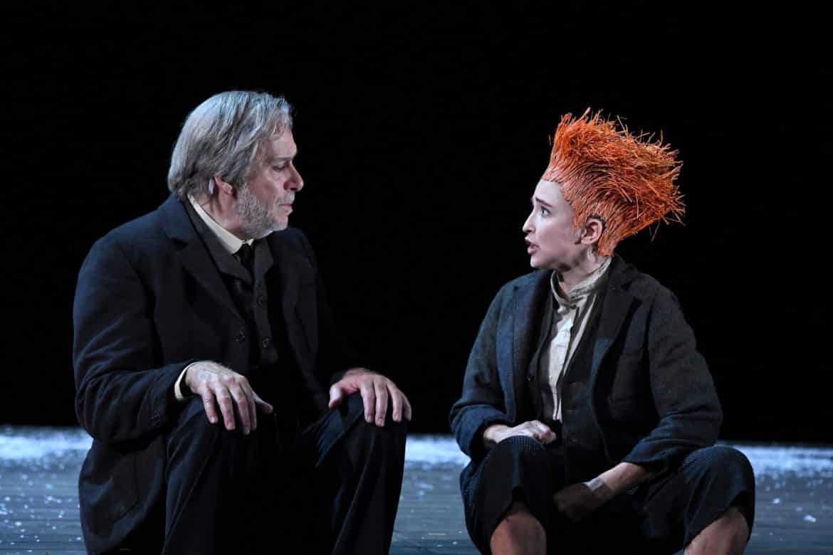 La troisième raison n’est pas la moins attractive : ménager l’alternance du parlé et du chanté est un atout pour captiver le « tout public », tout en s’inscrivant dans la tradition de l’opéra-comique ou des comédies musicales. En confiant à Poil de Carotte et au chœur d’enfants la place prépondérante des musicals, les concepteurs restituent la parole au sujet. Le compositeur français Reinhardt Wagner, complice de feu Roland Topor, puise dans ses expériences hybrides les ressources qui animent ce conte qui lorgne plus du côté de L’Opéra de quat’sous (K. Weill et B. Brecht) que de L’Enfant et les sortilèges (M. Ravel et Colette). Sa verve mélodique et rythmique, fortifiée au contact de la chanson (cabaret Il est grand temps de rallumer les étoiles) et des musiques de film (Faubourg 36 de C. Barratier), irrigue chaque numéro du conte. Si le langage néo-tonal ou les ostinati s’avèrent parfois lancinants, les danses de la Belle Epoque (valses) ou proches de notre temps (swing, jazzy, tango) flirtent avec d’heureuses réminiscences. Il nous semble repérer celles de Nino Rota (la B.O. d’Otto et mezzo de Fellini) ou de la chanson (Thomas Fersen). Dans cette ambiance populaire, l’orchestration inventive (Matthieu Roy) personnalise chaque saynète : un célesta lumineux lors du Cauchemar, un marimba pulsant le trio La Carabine, des cuivres percutants pour la coléreuse mégère, des bassons lestant la danse des Poux, etc. Cependant la palme poétique revient au tableau La Trompette. Dans la pénombre intime, le musicien d’orchestre (Nicolas Planchon, cornet) personnifie le jouet dont Poil de carotte est privé en égrenant une poignante mélopée, dans son rutilant costume décroché du Joueur de fifre de Manet. On repense à Gelsomina de La Strada…