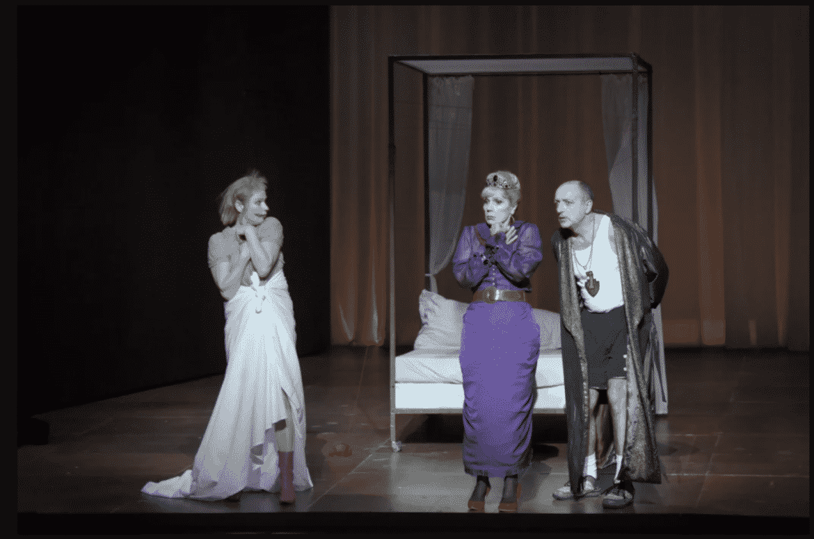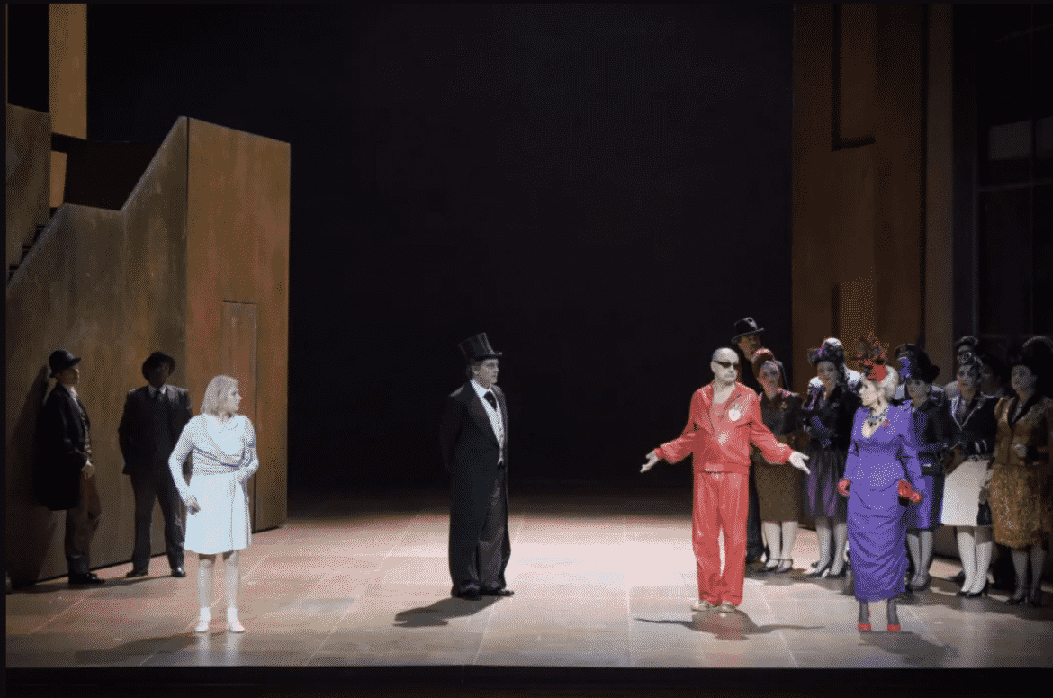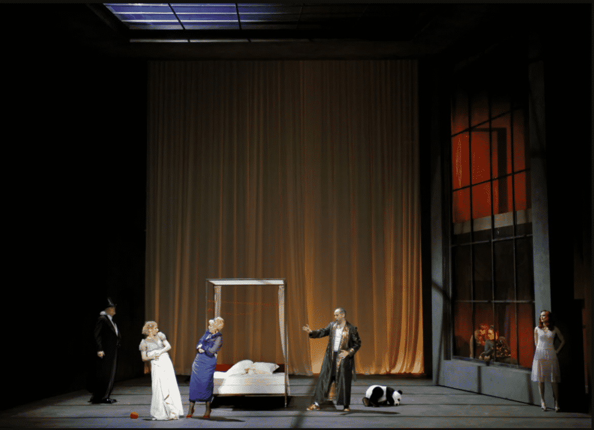 En onze ans, la mise en scène de Luc Bondy n’a rien perdu de sa beauté, de sa lisibilité ni de son efficacité, et la direction d’acteurs, malgré la disparition du metteur en scène il y a maintenant 5 ans, reste extrêmement travaillée, tous les chanteurs se révélant être d’excellents comédiens. Laurent Naouri notamment est parfait en roi vulgaire (vêtu d’un short ou d’un survêtement !), et il parvient parfaitement à traduire vocalement l’autorité mais aussi la cruauté et le cynisme du personnage. Béatrice Uria-Monzon (malgré une voix qui a de nouveau tendance à bouger un peu et une diction parfois prise en défaut) est irrésistible de drôlerie en reine tantôt coincée, tantôt délurée. On ne reprochera guère à Julien Behr qu’un très léger déficit de puissance par rapport à ses partenaires. À ce détail près, son incarnation du Prince Philippe est pleinement satisfaisante et le chanteur rend aussi bien justice aux quelques épanchements lyriques du personnage qu’à ses accès de brutalité. Impeccable chambellan de Jean Teitgen, voix puissante, timbre de bronze, articulation limpide. Les autres rôles sont tous fort bien tenus, avec une mention spéciale à Guilhem Worms, qui fait ici ses débuts à l’Opéra de Paris, et dont la présence vocale et scénique donne un très beau relief au rôle de l’Innocent ; à Loïc Félix et Christophe Gay (Cyrille et Cyprien pleins d’humour et constamment compréhensibles) ; et à Antoinette Dennefeld, Isabelle très impliquée et dont la voix, bien projetée, retient l’attention.