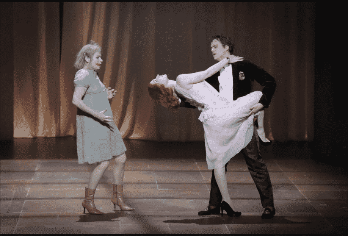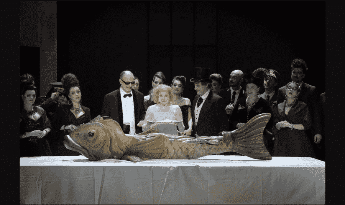 Et quel texte ! Le livret concocté par Luc Bondy et Marie-Louise Bischofberger, d’après la pièce homonyme de Witold Gombrowicz (pour ce qui est déjà sa quatrième adaptation à l’opéra) est un chef-d’œuvre d’humour noir, de cynisme, de cruauté : le sort de la pauvre Yvonne est on ne peut plus tragique : le Prince l’épouse par amusement et/ou par provocation vis-à-vis de la Cour ; Yvonne est rejetée par l’ensemble des courtisans puis par le Prince lui-même (la présence de la jeune femme, curieusement, a mis au jour toutes les pulsions violentes et malsaines renfermées au sein de chacun des personnages), et elle meurt en mangeant un poisson qu’on lui a servi en espérant qu’elle s’étrangle et s’étouffe avec les arêtes – ce qui ne manque pas d’arriver ! Remarquablement interprété par Dörte Lyssewski à l’allure hagarde et dégingandée, rappelant un peu la Yolande Moreau de l’époque des Deschiens, apathique, taciturne, vulgaire, laid, le personnage étonne autant qu’il agace, suscite le rire autant qu’il émeut. Bref, le spectateur s’interroge constamment sur le sens de l’action qu’on lui donne à voir, mais aussi sur la pertinence, le bien-fondé de ses propres réactions : ce n’est pas le moindre mérite du spectacle.