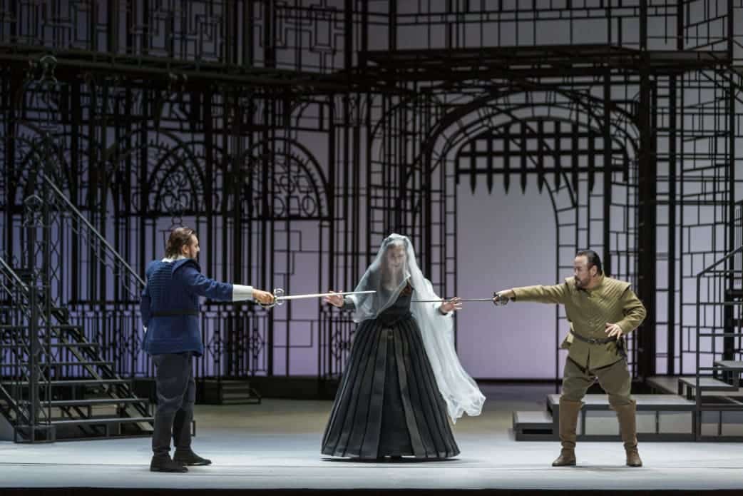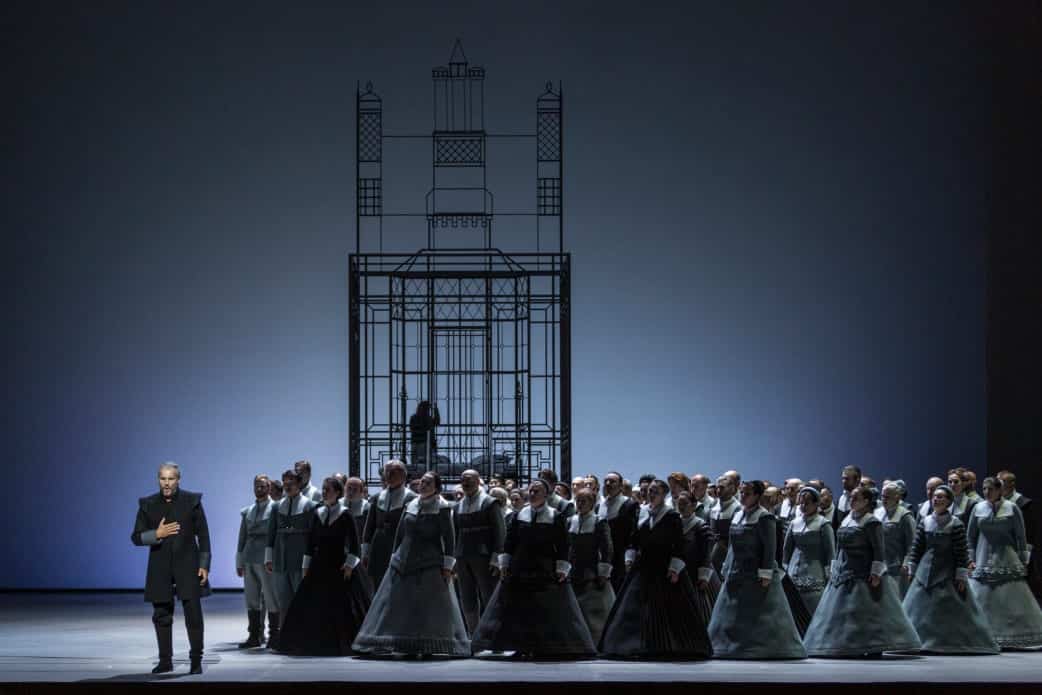 Est-ce grâce à l’excellence de l’exécution musicale ? Ou bien la direction d’acteurs, très précise et visiblement très travaillée a-t-elle été approfondie depuis la première série de représentations ? Toujours est-il que le spectacle nous a paru moins triste et plus intéressant qu’en 2013. Certes, le recours au plateau tournant vire au système et les couinements qu’il occasionne, surtout dans les moments de recueillement (l’introduction de la folie d’Elvire !) agacent un peu ; la façon de traiter les déplacements et la gestuelle du chœur (avec sautillements en cadence et brandissement mécanique des hallebardes) reste peu compréhensible et suscite toujours (malencontreusement) l’amusement du public ; les quelques projections (le visage d’Elvira, un ciel orageux au dernier acte) et les subtils éclairages de Joël Adam ne parviennent pas vraiment à atténuer l’impression de monotonie qui se dégage du spectacle, qui se déroule presque exclusivement dans des tons gris/gris-bleu. Mais enfin, encore une fois, le jeu des acteurs, précis et dense, convainc, et la lecture de l’œuvre, qui fait d’Elvira une femme d’emblée broyée par des événements politiques entrant en pleine contradiction avec l’aventure amoureuse qu’elle essaie de construire (elle n’y survivra pas, terrassée par l’émotion lors du chœur de réjouissances qui clôt l’œuvre) est plausible et cohérente.