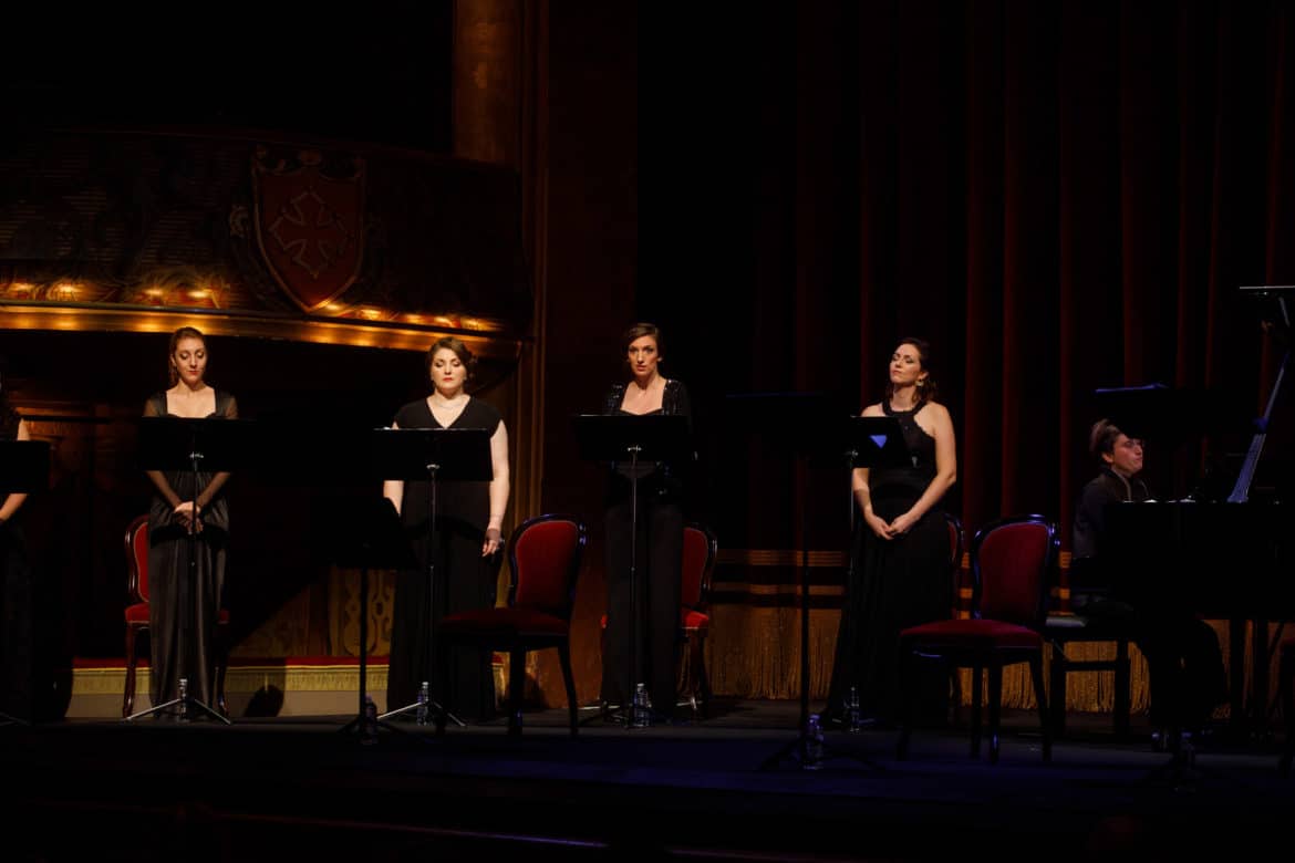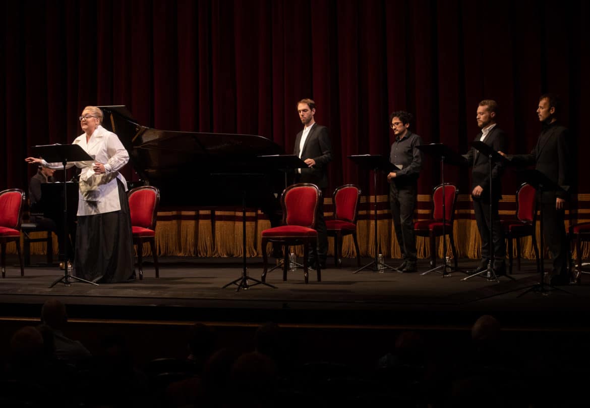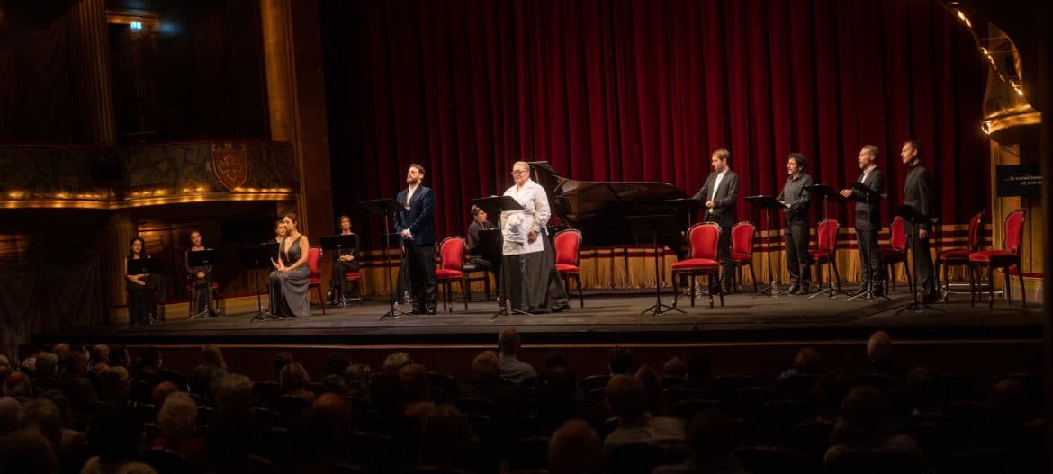 Pour cette version concertante, la disposition des artistes est une sorte de scénographie hiératique qui convient à la représentation de l’Antique. Ils sont disposés en arc de cercle avec le piano derrière, le gynécée des femmes (côté Jardin) regroupe les cinq servantes et la nourrice Euryclée. Il s’oppose au clan des hommes (côté Cour), soit les quatre prétendants et Eumée, tandis que Pénélope ou Ulysse (ou tous deux) siègent au centre de cette constellation. Tous et toutes sont d’une beauté saisissante en tenue noire de soirée, le blanc étant réservée à l’héroïne.