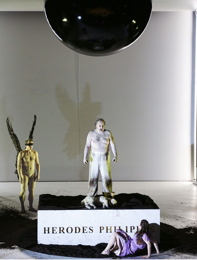 La lecture du metteur en scène vénitien est toujours aussi fidèle au texte, qui réinterprète dans une tonalité symbolique et psychanalytique (l’époque à laquelle Strauss composa son opéra sont contemporaines de Freud) l’histoire biblique des fils d’Hérode le Grand, à savoir Hérode Antipas (tétrarque de Galilée entre 4 avant J.-C. et 39 après J.-C.) et Hérode Philippe (tétrarque d’Iturea, Traconite et Golan entre 4 avant J.-C. et 34 après J.-C.). À la mort de ce dernier – l’histoire se situe donc entre 34 et 39 après J.-C. – Hérode Antipas avait épousé sa femme qui avait auparavant donné naissance à une fille, Salomé, laquelle est donc la belle-fille de son oncle, très exactement comme Hamlet. Comme dans Hamlet, on soupçonne que le premier mari a été supprimé par le second, c’est en tout cas ce que semble suggérer Michieletto. Le metteur en scène donne à voir l’arbre généalogique, afin d’accentuer la fait que sa lecture soit basée sur les liens familiaux : Salomé est traitée comme une enfant par son père qui lui donne une poupée avant de la mettre au lit, une figure enfantine qui d’ailleurs reviendra plusieurs fois au cours de la pièce. Cette clé d’interprétation n’est certes pas nouvelle, mais elle est chère au metteur en scène qui l’a appliquée à d’autres productions telles que Guillaume Tell et Macbeth.