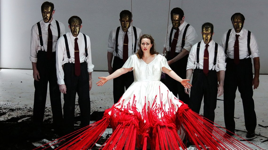 La mise en scène prend appui sur les couleurs mentionnées dans le texte : blanc, noir et rouge. La première couleur est celle du palais d’Hérode, un environnement d’une blancheur éblouissante dans la scénographie caire de Paolo Fantin, encadrée par des néons froids ; le noir est la couleur de la terre de la prison de Jochanaan et de la lune ; le rouge est évidemment la couleur du sang de Narraboth et de la tête du Baptiste, qui s’égoutte dans le bassin d’argent. Le fond de la scène s’ouvre sur des souvenirs d’enfance réveillés par la voix du prophète ou sur le banquet d’Hérode. Il y a aussi la citerne circulaire creusée dans le sol d’où émerge Jochanaan. Pendant la « danse des sept voiles », la protagoniste revit l’histoire qui la lie à son père, mais aussi sa relation incestueuse avec son beau-père, personnifiée par des figures masculines masquées qui, à la fin, l’habillent d’une robe blanche à laquelle pendent de longs fils rouges, une robe qui monte vers le ciel. Avec la mort de Jochanaan, le sacrifice sera accompli. L’agneau abattu, le sang versé, le calice, tout renvoie à la figure de Baptiste. Une autre référence picturale forte est celle de sa tête auréolée et rayonnante comme dans le tableau de Gustave Moreau L’apparition (1877). Une fois de plus, la magie de l’équipe bien rodée Michieletto, metteur en scène / Paolo Fantin, scénographe / Alessandro Carletti, lumières, Carla Teti / costumes – fait de ce spectacle un ensemble visuellement cohérent et intrigant.