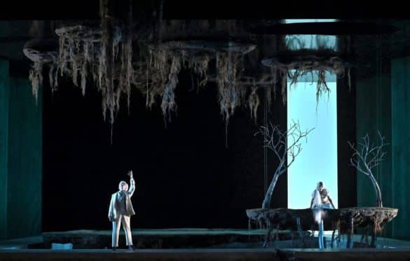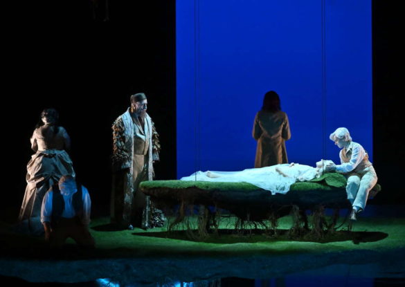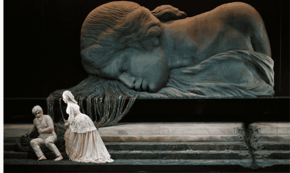 André Barbe s’occupe des costumes et du design, Renaud Doucet de la mise en scène proprement dite. Ils ont plus d’une vingtaine de productions lyriques à leur actif, dont une Flûte enchantée à Glyndebourne en 2019 qui avait fait sensation [1]. À Parme, ils ont opté pour un symbolisme onirique qui fonctionne admirablement. Chaque personnage est traité comme une île énigmatique et solitaire à laquelle renvoient les éléments de décor suspendus. L’impossible d’une communication entre les êtres est portée à incandescence par la musique de Debussy. Sur la scène du théâtre Regio de Parme, l’onirisme en devient le reflet.