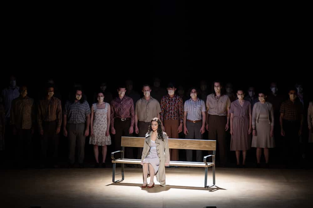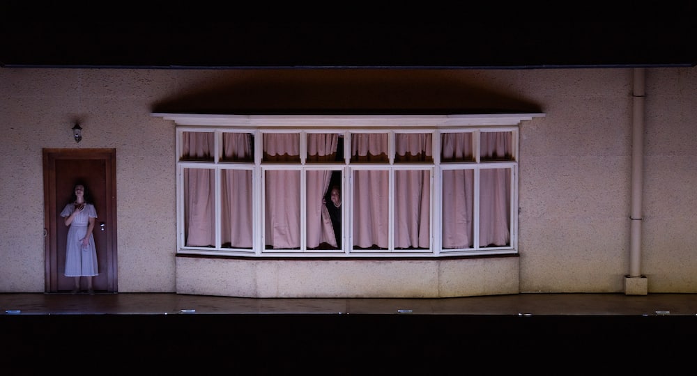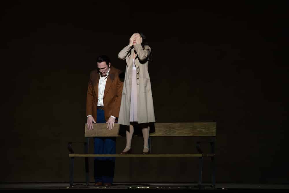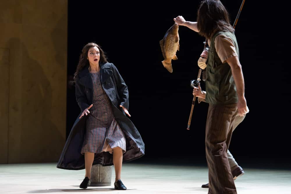 La scénographie d’Antony McDonald (il a également conçu les costumes) consiste en une grande boîte en bois fermée dans laquelle un élément scénique est inséré afin de former l’intérieur bourgeois des Kabanov (le décor est celui des années 1970). Pivotant sur elle-même, elle devient la maison vue de l’extérieur, c’est-à-dire du jardin du deuxième acte où a lieu la rencontre des deux couples d’amoureux et où un triste lampadaire triste éclaire la scène, simplement occupée par un banc. Le vieux palais à moitié détruit dans lequel se réfugient les personnes prises dans la tempête de l’acte III devient un abri pour arrêt de bus, et la Volga dans laquelle les jeunes villageois lancent leurs cannes à pêche n’est autre que la fosse d’orchestre. Les eaux de la rivière qui engloutissent la malheureuse dans l’éclair final sont en fait les villageois eux-mêmes, lesquels ont d’abord ignoré puis condamné le comportement de la jeune femme (« Pourquoi me traitent-ils ainsi ? On dit qu’il fut un temps où les femmes comme moi étaient condamnées à mort… »), et qui maintenant l’emportent, telle une immense vague. La conception des éclairages, signés Lucy Carter, est complexe, mais n’est réalisée qu’imparfaitement à certains moments de la représentation. La lecture de Richard Jones est appréciable quand il s’agit de souligner la différence entre la jeune fille et son environnement, mais elle n’est pas pleinemùent convaincante dans le finale : tout au long de la représentation, les allées et venues nerveuses des passants et d’un cycliste ponctuent l’action ; ils ne quittent la scène qu’à la toute fin de l’action ; ne reste plus, sur le sol, que le corps de Kátia sur lequel se penche son mari  (bien que le livret signale qu’il s’éloigne dans un état d’agitation…), tandis que sa belle-mère reste cloîtrée, sur le côté, peut-être en proie remords. C’est du moins ce que l’expression de Susan Bickley laisse à penser, même si les derniers mots du personnage ne le laissent guère entendre !