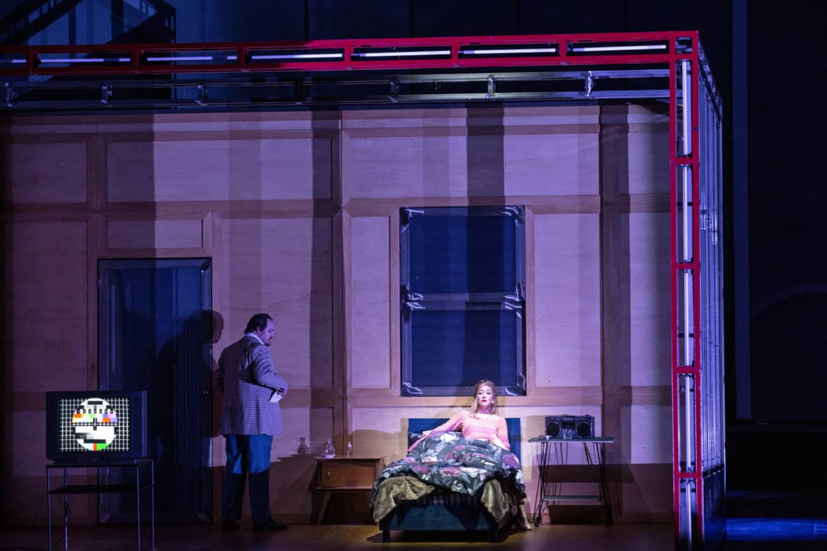 La distribution, irréprochable, sait son Bernstein sur le bout des doigts. Le duo Dede-Junior est interprété par Claudia Boyle et Gordon Bintner, déjà présents dans l’enregistrement de l’œuvre chez Decca (Orchestre symphonique de Montréal, Kent Nagano, 2017). La soprano irlandaise émeut par son incarnation d’une Dede vaillante et vulnérable, consciente des failles que sa mère lui a laissées en héritage mais bien décidée à ne pas s’y laisser engloutir. Le baryton canadien, bigger than life, impressionne par son timbre capable de nuances infinies, tour à tour vindicatif, rageur, enfantin ou rieur (cf son « What a day, what a day, for a café au lait » clin d’œil à la scène de l’Autodafé de Candide). Un bégaiement, un lapsus ou une posture maladroite lui suffisent pour laisser deviner toute la fragile complexité de sa psyché. Dans le rôle de François, le ténor Frédéric Antoun occupe avec finesse le rôle de « pièce rapportée » dont le chant émaillé d’expressions françaises traduit la position inconfortable ; il est à la fois celui par qui le scandale arrive et celui par qui l’abcès se crève. Enfin, Russell Braun campe un Sam inoubliable. Mari aveuglé, père intolérant, mais dans les deux cas chargé d’un amour qui peine à trouver son expression, il bouleverse dans une scène que l’on doit tout entière à Warlikowski mais qui fusionne à la perfection avec l’esthétique bernsteinienne : tandis que Sam s’effondre d’émotion en lisant la lettre d’adieu laissée par Dinah, dans la chambre voisine, Junior-enfant regarde à la télé Lenny expliquer au public des Young People’s Concerts qu’un passage de la 4e Symphonie de Tchaïkovski lui semble exprimer le désir impossible à assouvir. À cet instant, l’orchestre dans la fosse et les chanteurs sur le plateau se taisent, mais jamais on n’a mieux entendu la musique de Bernstein.