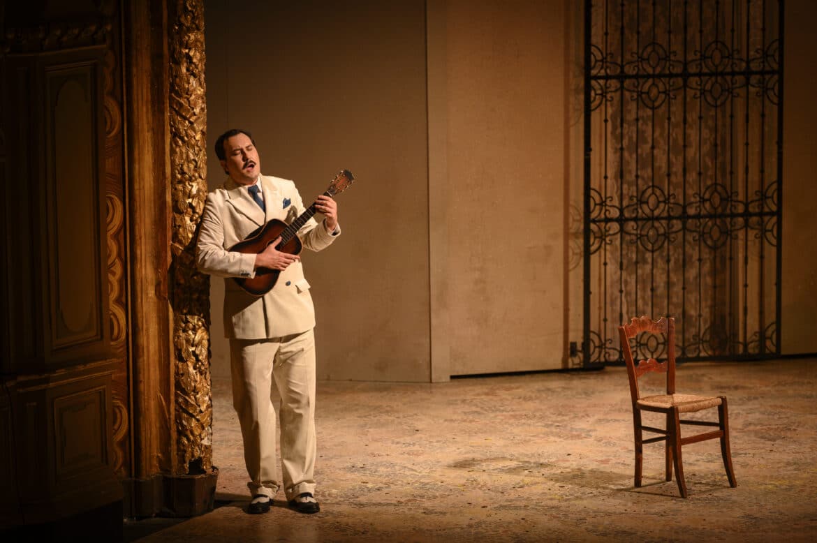 Familier du rôle de Bartolo qu’il a notamment déjà interprété au théâtre des Champs-Élysées et à l’opéra de Marseille, Pablo Ruiz apporte au casting de ce Barbier une touche d’hispanité et, en premier lieu, un artiste impayable dans la grande tradition des chanteurs bouffes. D’une stature moins impressionnante que celles de Ruzil Gatin ou de Vittorio Prato, le baryton espagnol campe un docteur irascible, nerveux comme un comédien de cinéma burlesque, et tendrement ridicule dans un improbable costume de couleur orangée. L’aria « A un dottor della mia sorte » est pour le personnage de Bartolo un test redoutable tant la rapidité du débit exigé par l’écriture rossinienne met à l’épreuve la souplesse des gosiers les plus éprouvés à la discipline belcantiste. Pablo Ruiz s’en tire avec tous les honneurs, comédien à chaque phrase sans jamais perdre en musicalité ni en lucidité. Et si la sonorité du timbre s’altère en fin d’aria à cause de la fatigue, le chanteur en tire parti pour faire rire à ses dépens, ce qui ne l’empêche évidemment pas de rebondir dès le finale du premier acte qu’il assure avec un aplomb vocal époustouflant. Lorsque Bartolo se plaint à l’officier sur un train d’enfer « Questo soldato m’ha maltrattato », on a peine à imaginer qu’une telle santé vocale soit possible après déjà près de 90 minutes en scène !
