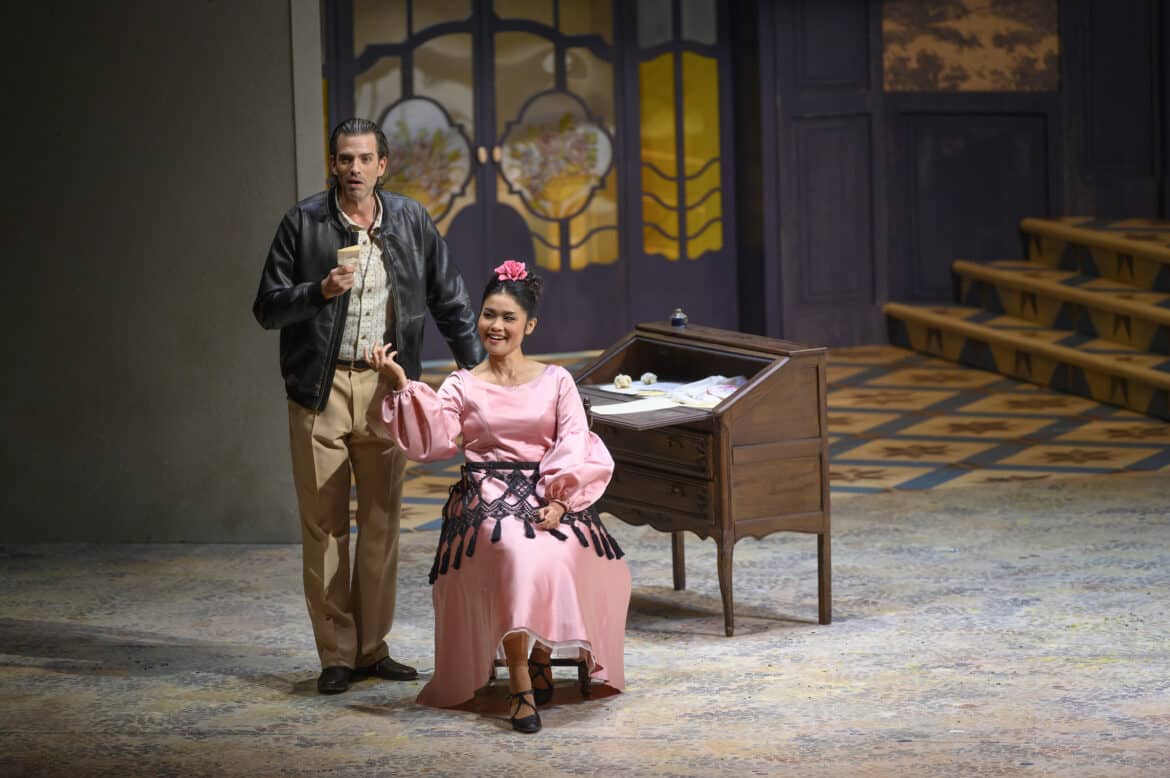 L’idée de Vincent Dujardin de transposer l’intrigue du Barbier de Séville dans l’Espagne ultra-conservatrice des années 1950 et de soigner la direction dramatique des chanteurs avec la même rigueur que celle d’un metteur en scène de cinéma est riche de promesses aguicheuses, mais force est de reconnaître que l’intention fait pschitt et que les interactions entre les personnages sont finalement trop superficielles pour vraiment entrer dans le vif du sujet et explorer pertinemment la cohabitation compliquée entre franquistes et anciens républicains quinze ans à peine après la fin de la Guerre Civile.