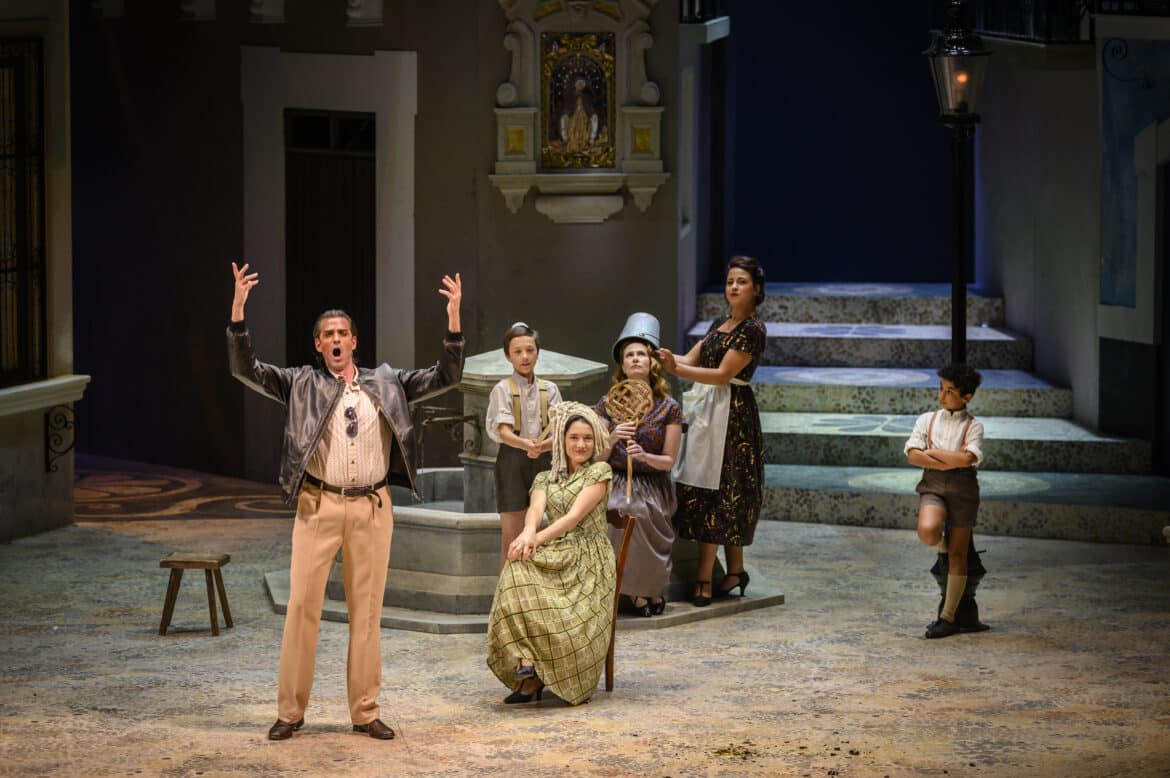 Tout le talent de Vincent Dujardin consiste à animer ce superbe décor d’une véritable vie de quartier. Outre qu’une légère brise fait constamment onduler les voilages qui prémunissent les appartements andalous contre la morsure du soleil, la variation des élégants éclairages de Bruno Ciulli restituent tour à tour les lueurs blêmes de l’aurore, la lumière aveuglante du soleil à son zénith et les éclairs d’une soirée orageuse. Des ombres passent derrière les rideaux, des têtes apparaissent aux fenêtres quand un importun chante la sérénade à une heure indue et deux enfants à la silhouette tout droit sortie de La mala educación de Pedro Almodovar tuent leur ennui en venant patauger dans l’eau de la fontaine ou en courant derrière le scooter du barbier du quartier. Tous ces déplacements sont parfaitement millimétrés et contribuent à une illusion théâtrale di qualità.