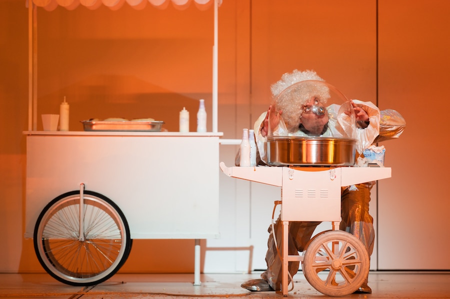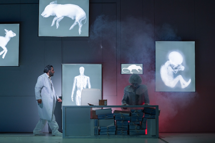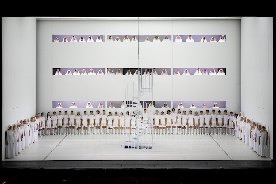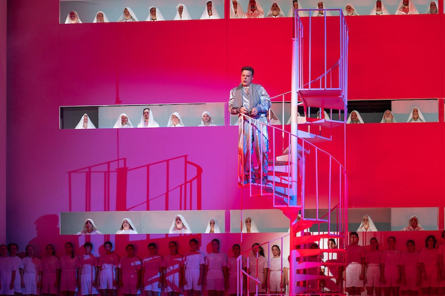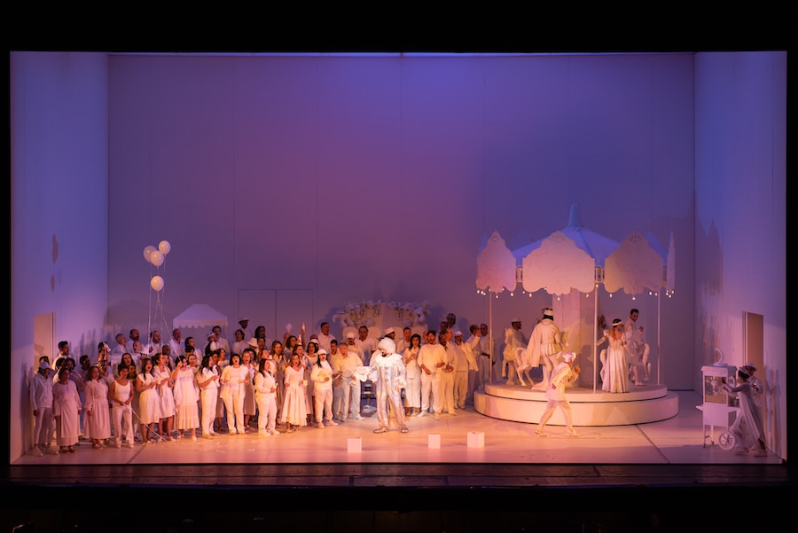 Le metteur en scène germano-australien a conçu de nombreuses productions très fortes, la dernière en date étant la belle Passion grecque à Salzbourg l’été dernier, mais celle-ci n’est guère convaincante, bien que reposant sur des postulats valables, comme celui de rajeunir une tradition poussiéreuse. Le Mefistofele de Boito est le fruit d’une vision esthétique qui ne nous appartient plus, et Robert Carsen a bien fait de lire avec ironie cette œuvre où le sublime est inextricablement lié au kitsch, tous deux absents ici dans la lecture froide et analytique de Stone, réalisée d’ailleurs sans grâce. On ne peut expliquer autrement l’élaboration de ce monde aseptisé et glacé, perpétuellement plongé dans le blanc d’installations scéniques conçues par Mel Page) : du parking désert du prologue au bassin rempli de boules de plastique colorées, du manège du premier acte à l’escalier grossier, des colonnades de plâtre au fauteuil-botola de la maison de retraite du finale, elles sont d’une rare laideur. Les costumes de Page sont également incongrus : on peut éventuellement choisir de déguiser Méphistophélès en clown, mais pourquoi Marguerite, la « jeune fille du village » dont le père est un « homme rude », est-elle vêtue de lamé d’or ? Et pourquoi Faust, chevalier « splendidement vêtu », porte-t-il tenue de camouflage ?