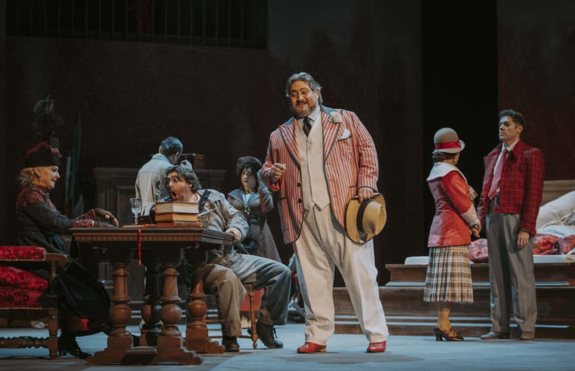 Rendons nous à l’évidence : la plupart des productions de Cavalleria Rusticana se contentent souvent d’un dispositif scénique assez sommaire où, parachevé par la statue d’une madone, l’église est à droite, l’auberge et la maison de Mamma Lucia à gauche et la place au milieu. De même, l’acte unique de Gianni Schicchi conduit nécessairement à un lever de rideau sur la chambre de Buoso Donati où un lit – plus ou moins imposant – se dresse quelque part dans l’espace scénique. Tout va donc reposer, dans ces deux ouvrages, sur un travail de fond avec les interprètes, ici plus que jamais acteurs-chanteurs. Avouons-le : la déception est grande de ce côté-là puisque la mise en scène de Grischa Asagaroff ne parvient jamais – surtout dans Cavalleria – à trouver la voie d’un jeu scénique qui devrait mêler à un lyrisme parfois exacerbé la violence des passions des principaux protagonistes et la force des traditions religieuses, sans que soit mise de côté la sensualité des personnages ni le vernis de vie quotidienne paysanne. Ainsi, on n’insistera pas sur les mouvements de foule, au lever de rideau puis pendant la célèbre procession, où la chatoyance des costumes de Luigi Perego – qui signe également les décors – et les efficaces lumières de Gigi Saccomandi dissimulent rapidement assez mal le caractère répétitif (les voleurs à l’étalage n’en finissent plus de…voler et les carabiniers de les…poursuivre !) et, plus gênant, le manque de progression dans la tension dramatique. Moins flagrant dans l’opus puccinien – du fait, d’une part, de la supériorité du livret et de la vivacité permanente de la langue et, d’autre part, de la vis comica exceptionnelle du rôle-titre – un travail plus fouillé sur le couple Santuzza/Turiddu aurait sans doute permis au drame musical mascagnien de davantage prendre son envol. Au lieu de quoi, on s’en remet ici au talent d’acteur de protagonistes qui emportent davantage l’adhésion dans la conversation en musique qu’est Schicchi que dans le mélodrame de Mascagni !