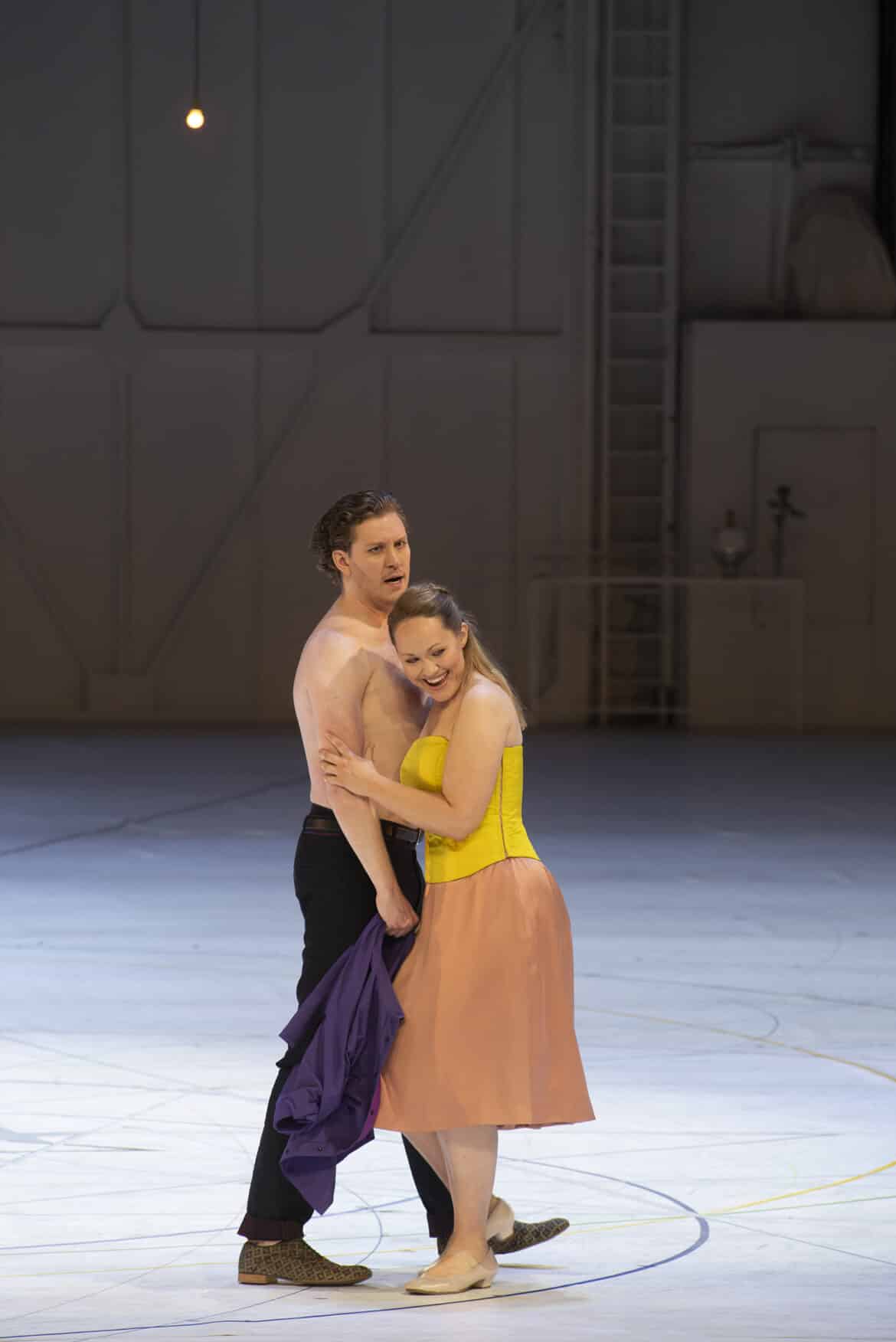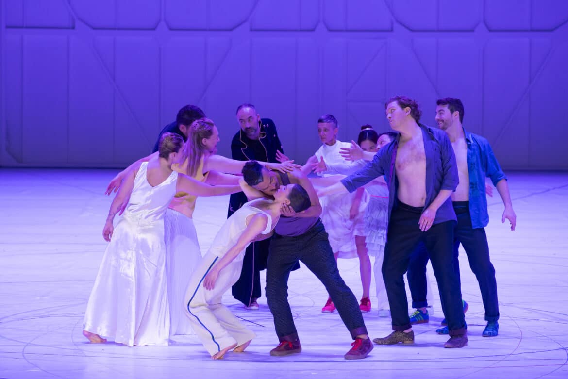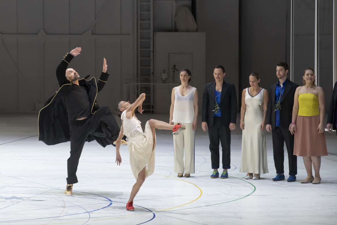 La mise en scène chorégraphiée d’Anne Teresa De Keersmaeker est bien connue du spectateur parisien, puisqu’il s’agit de sa deuxième reprise depuis sa création, toujours au Palais Garnier, l’hiver 2017, relayée par la série de septembre-octobre de la même année. Rappelons donc brièvement ses lignes directrices et ses temps forts. Les coulisses du théâtre en guise de décor unique, conçu par Jan Versweyveld, entièrement peint en blanc, des panneaux transparents sur les deux côtés. Les six personnages doublés chacun d’un danseur, devant « rendre visible l’intérieur de ce personnage », comme nous le rappelle dans le programme de salle Jan Vandenhouwe, auteur de la dramaturgie. La tension entre un cercle central et ses trajectoires. Un centre dont on s’éloigne, symbole du tournant d’une époque, ajoute la metteure en scène elle-même : la Révolution de l’année précédente, la mort prochaine de Mozart. La danse entendue comme « une troisième voix visible, après le texte et la musique. Une gestuelle des mains à la Bob Wilson, doublée de mouvements harmonieux de la tête et du buste qui ont la qualité appréciable de ne jamais mettre les chanteurs en péril.