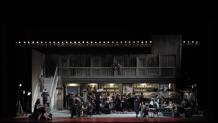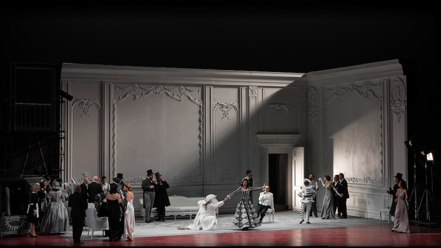 Les références cinématographiques dans la mise en scène d’un opéra aujourd’hui ne sont certes pas nouvelles : rappelons, parmi beaucoup d’autres, la mise en scène de La Cenerentola par Alessandro Talevi, le brillant Ciro in Babilonia de David Livermore et Il turco in Italia de Fellini, La fanciulla del West de Robert Carsen. Mais là, c’est le monde du celluloïd qui a été reconstruit, l’esprit du cinéma plutôt que la simple citation d’images cinématographiques – qui doivent être judicieusement dosées car dans la perception, la vision prédomine sur l’ouïe, elle est plus immédiate et capte d’abord l’attention du spectateur. Dans la mise en scène de Bernard, le noir et le blanc dominent manifestement dans les costumes de Carla Ricotti et les décors d’Alessandro Camera, éclairé par les lumières de Fiammetta Baldiserri. Au premier acte, la place d’Amiens est l’intérieur d’une gare routière animée par les allées et venues confuses des nombreux voyageurs, et la rencontre des deux jeunes gens se perd dans la multiplicité des scènes et des contre-scènes sur le plateau encombré. Le second acte prend place dans l’élégant salon de la maison de Géronte, où il n’y a pas de lit douillet mais un écran de cinéma diffusant des extraits des Enfants du paradis et même l’arrivée de Jean-Louis Barrault « Pierrot » pour divertir la jeune femme qui s’ennuie.