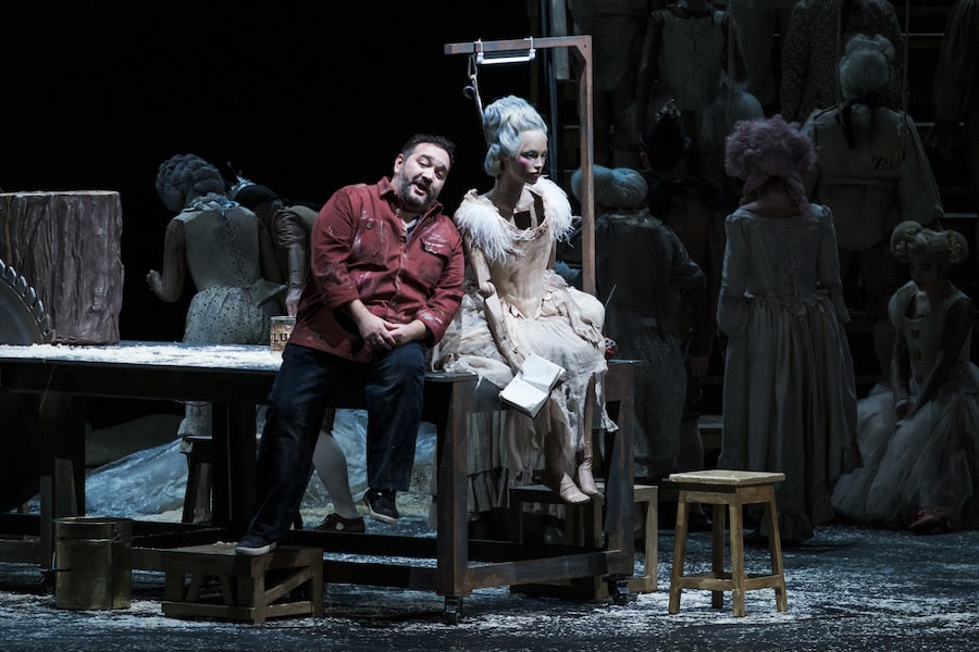 Une interprétation riche – peut-être trop – et chargée de symboles du jeune et talentueux Daniele Menghini, dont le Ballo in maschera a été très apprécié lors du récent Festival Verdi. Venu d’un autre Teatro Regio, celui de Parme, cet Elisir d’amore plaît au public, notamment parce que le metteur en scène réussit à le séduire par sa technique théâtrale sûre, parfois même trop exposée, et par des images très suggestives. Pas de village de campagne, de gerbes de foin ou de moissonneuses : les costumes XVIIIe siècle de Nika Campisi rappellent ceux des marionnettes de la Fondation Grilli (à Parme, c’étaient ceux du Musée Giordano Ferrari), tandis que les décors de Davide Signorini recréent un monde sombre et onirique qui rappelle Freaks de Browning, avec une main géante et menaçante d’où pendent les fils des marionnettes, tandis que les lumières de Gianni Bertoli soulignent l’artificialité du décor.