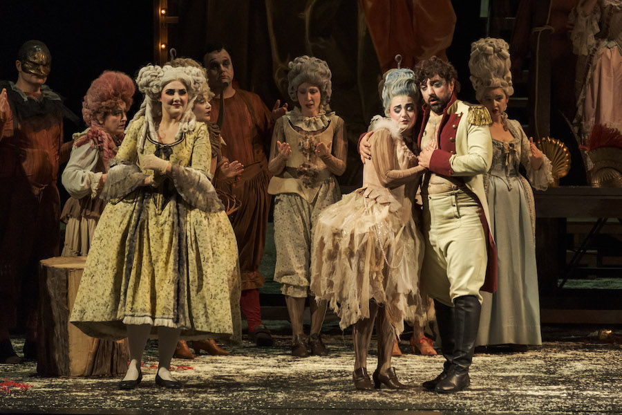 Enfin, Federica Guida. Certes, les Adina « soubrettes » ne sont pas les plus agréables, mais ici la soprano palermitaine fait preuve d’un tempérament trop fort pour le personnage, avec un timbre peu agréable et une émission toujours trop forte. La Giannetta d’Albina Tonkikh (du Regio Ensemble) est convaincante, et le chœur est non seulement excellent musicalement sous la direction d’Ulisse Trabacchin, mais il améliore de plus en plus sa présence scénique, une qualité qui n’est pas toujours évidente dans les chœurs italiens. On l’avait déjà remarqué dans Manon Lescaut d’Auber – dont on aimerait d’ailleurs voir Le Philtre[i], tiré, comme L’Elisir d’amore, de la même pièce de Scribe, et autrefois très populaire en France – et ici aussi, les mouvements et les gestes, avec l’aide des talentueux mimes-danseurs, ont été extrêmement efficaces.
