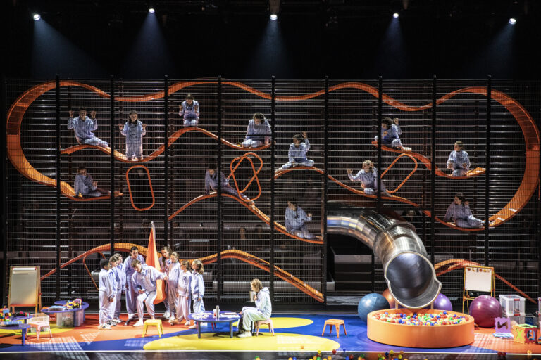 Le Regietheater a encore fait des ravages. Cette habitude lassante de saturer l’espace par mille objets qui surinterprètent l’intrigue pour soi-disant mieux guider le spectateur illustre le degré zéro de la mise en scène et produit l’effet exactement inverse. L’œil est constamment détourné, pollué par l’inessentiel et finit par oublier l’interprète. On y voit un tsarévitch autiste, une urne versée sans raison apparente, une scène du sacre qui a troqué la couronne avec un tabouret renversé, Xénia pendue (?) et une scénographie d’abord explicitement inspirée de Dogville (des gradins imaginés par Zinovy Margolin constituant autant de petits groupes censés incarner le peuple), puis, dans la deuxième partie, un décor tout droit venu d’Ikea et de Mc Do qui devient l’espace ridicule de la mort de Boris plongeant dans une piscine à balles. Comment être frappé de stupeur (ce qu’indique la didascalie du livret), après une scène aussi affligeante ? L’affront fait à l’intelligence du spectateur atteint ici des sommets.