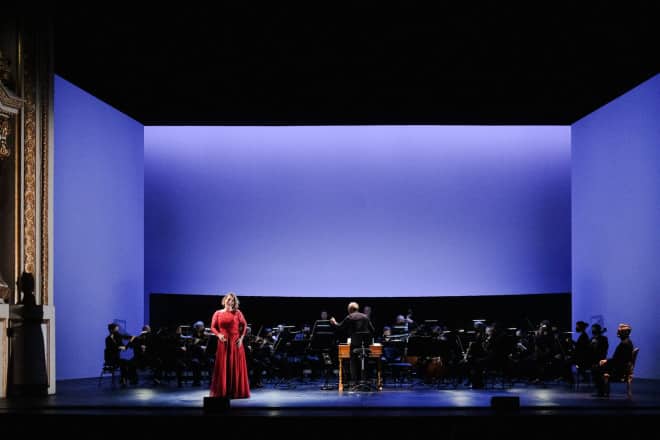 Comme nombre d’opus du genre opera seria, les quasi quatre heures – avec entractes – que dure Alcina de Haendel étaient incompatibles avec une vie économique et sociale à peu près normale balisée par un couvre-feu à 21 heures. Aussi, Alain Perroux et l’Opéra national du Rhin ont-ils opté pour une version abrégée en concert légèrement scénographiée. La sélection d’airs – une vingtaine, sur les quarante-quatre numéros que compte l’ouvrage – tient compte non seulement des équilibres dramatiques entre les rôles, et des incontournables moments de bravoure, vaillants ou intimes, mais aussi, peut-être, des choix de la mise en scène de Serena Sinigaglia initialement programmée – étrennée à Nancy pour une seule représentation le 11 mars 2020, avant la fermeture précipitée des salles au public, pour les causes sanitaires que l’on sait – et qui avait maintenu le petit rôle d’Oberto, souvent sacrifié.