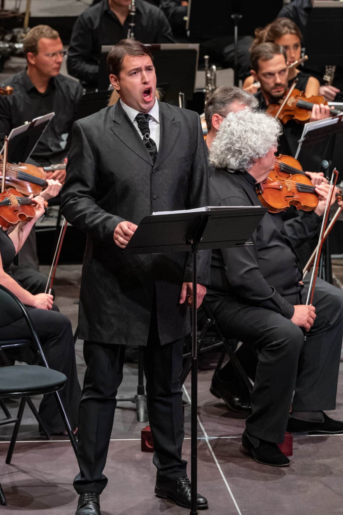 Faust (Alexander Mikhailov) ouvre l’opéra, son chant est particulièrement attentif à la prononciation des paroles, parfaitement intelligibles du public sans l’aide des sous-titres, ce qui représente une prouesse technique, de surcroît de la part d’un étranger. Le ténor chante avec le voile du palais relevé en arrière, il obtient de ce fait un timbre infaillible et une retenue vocale qui lui permettent de ne pas noyer le texte du livret dans un magma sonore informe. Parfaitement appliqué, il réalise des descentes chromatiques avec timbre et soutien, notamment dans son exclamation “Ô mon âme”. Par ailleurs, ses aigus sont bien placés et atteints sans forcer. Il témoigne de manière générale d’une voix très égale. Sa capacité à faire comprendre les paroles au public permet de mettre en relief l’aspect métatextuel et à apprécier les mises en abîme multiples que recèle l’opéra de Berlioz, en particulier dans “Chants plus doux que l’aurore, retentissez encore”. De plus, l’interprétation de Mikhailov, attentive à l’intelligibilité du texte, permet de considérer le livret de l’opéra tout autant que la musique et de remarquer ainsi les multiples talents de Berlioz, musicien et écrivain, plus précisément compositeur et librettiste en ce qui concerne la Damnation de Faust, inspirée du Faust de Goethe traduit par Nerval, et qu’Almire Gandonnière a contribué à adapter en livret. Ainsi, le public est amené à méditer sur les tourments faustéens : “Par le monde où trouver ce qui manque à ma vie ?/ Je chercherai en vain où fuit mon âpre envie”.