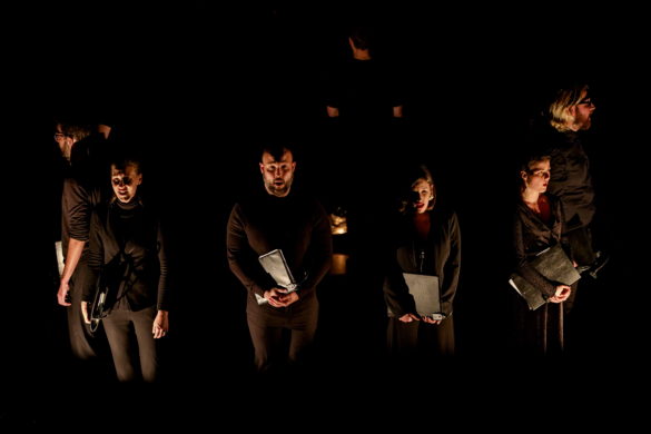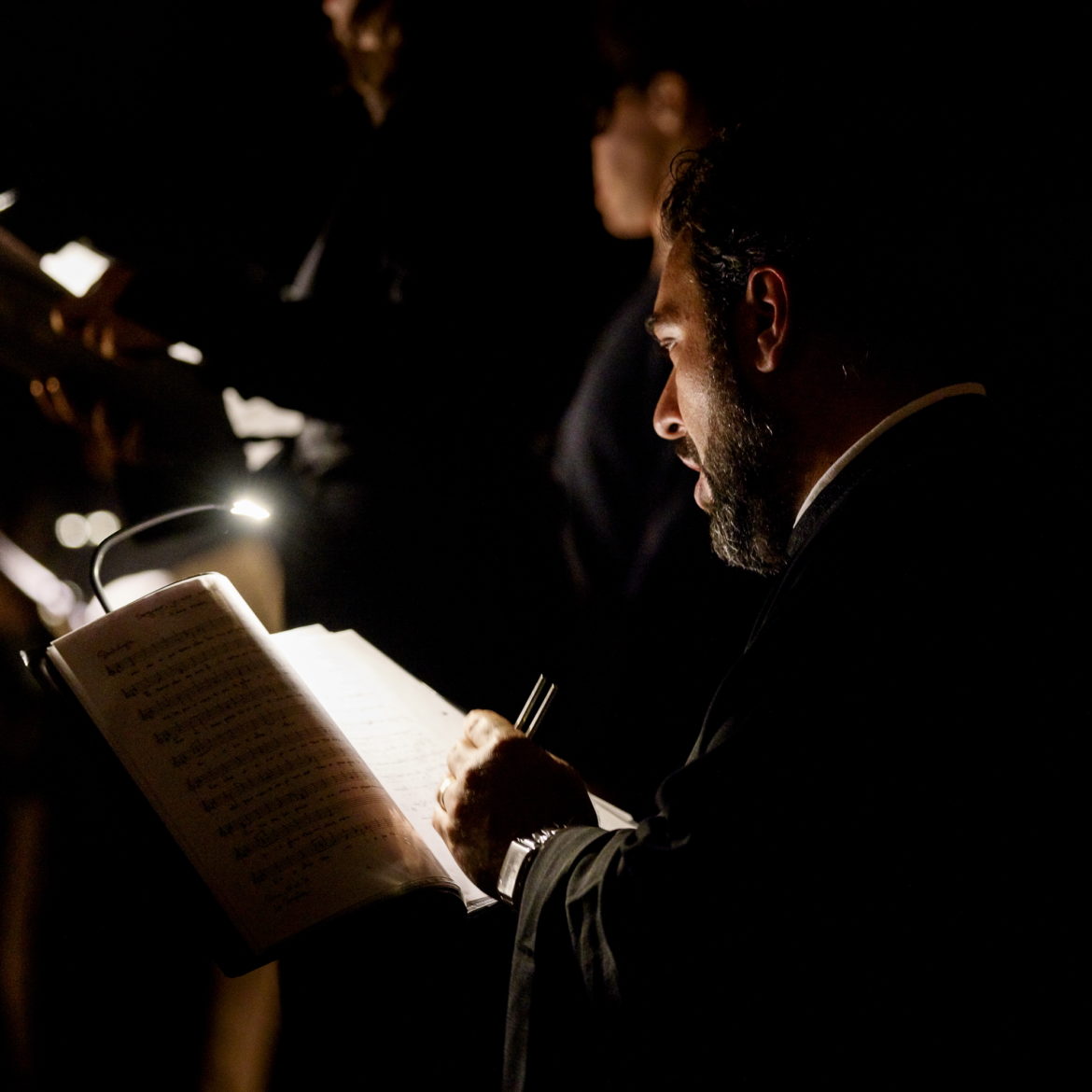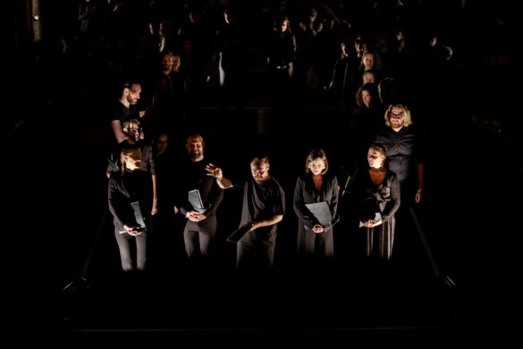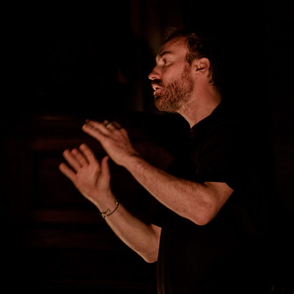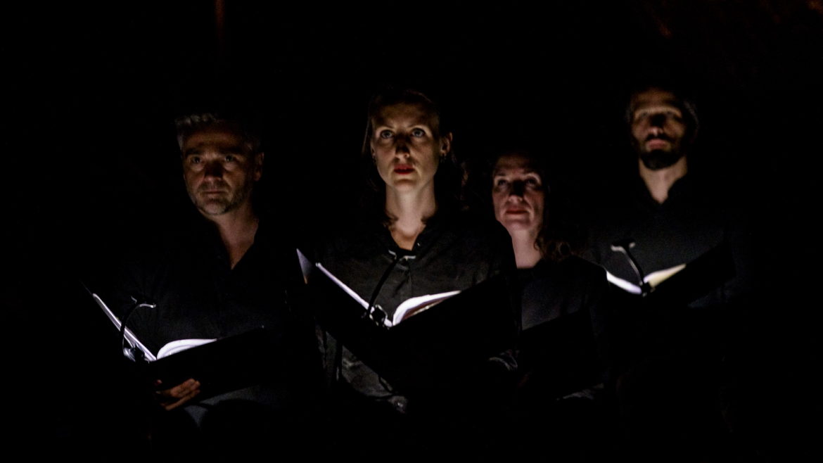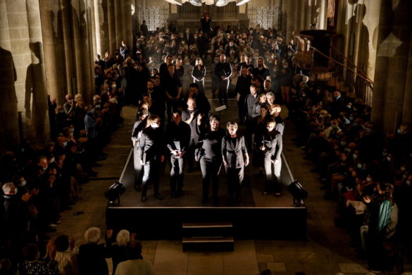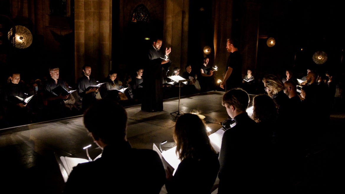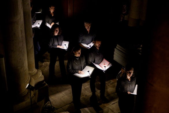 « Notre projet vise à recréer un rituel imaginaire, mêlant les Vêpres de Rachmaninov aux chants byzantins orthodoxes, et se déployant aussi dans l’utilisation totale de l’espace par les chanteurs, proposant ainsi un voyage intense dans une des plus grandes œuvres de l’art vocal », déclare Simon-Pierre Bestion sur le site de la compagnie La tempête dont il est le directeur artistique. (Concernant le chant byzantin orthodoxe, il faut signaler les splendides interventions d’Adrian Sîrbu, tantôt pleines de recueillement, tantôt empreintes d’une ferveur communicative).
