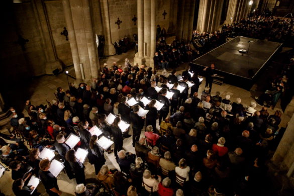 Et de fait, c’est bien à une sorte de rituel que le public a l’impression d’assister. Un rituel qui transcende de loin la seule musique et qui, au-delà des croyances ou convictions de chacun, donne le sentiment exaltant de tutoyer le Sacré. Pour ce faire, différents procédés sont mis en œuvre, au premier rang desquels figurent certains effets de spatialisation visuelle et sonore. Les choristes déambulent lentement, se regroupent sur ou autour de l’estrade en une sorte de communion spirituelle et musicale, forment des petits groupes dans le chœur, le narthex ou dans les bas-côtés… Cette spatialisation multiplie nécessairement les sources sonores, le chant surprenant l’oreille du spectateur par ses provenances variées, parfois inattendues, sans pour autant créer le moindre effet de théâtralité. Au contraire, l’impression produite est celle d’être cerné par, ou immergé dans le divin. L’éclairage extrêmement tamisé (sauf à la toute fin du concert, où les lumières des projecteurs évoquent l’éclairage vacillant des flammes de bougies) participe du recueillement général dans lequel est plongé le public, d’une attention et d’une qualité d’écoute exceptionnelles.