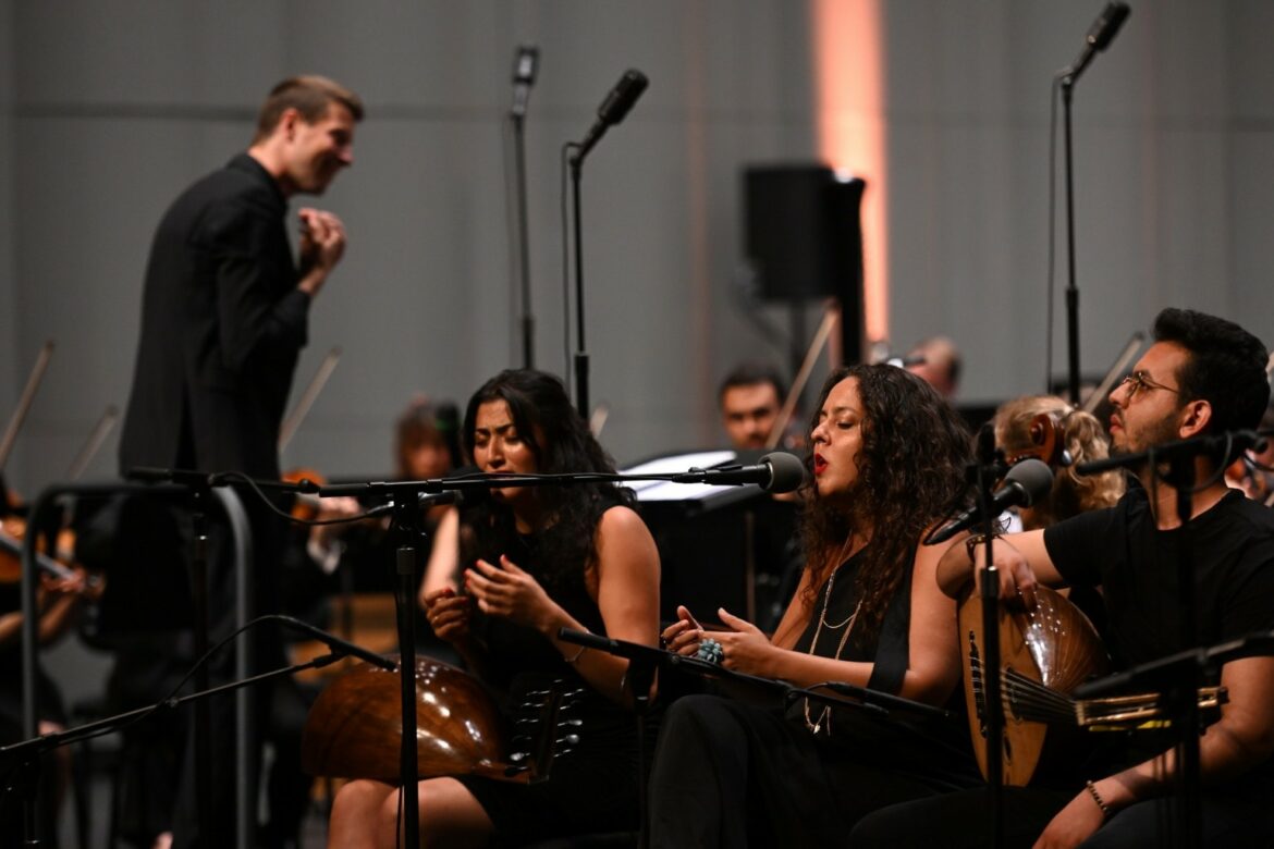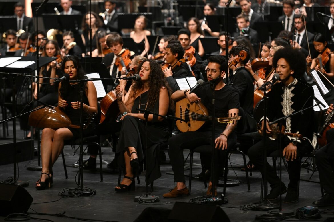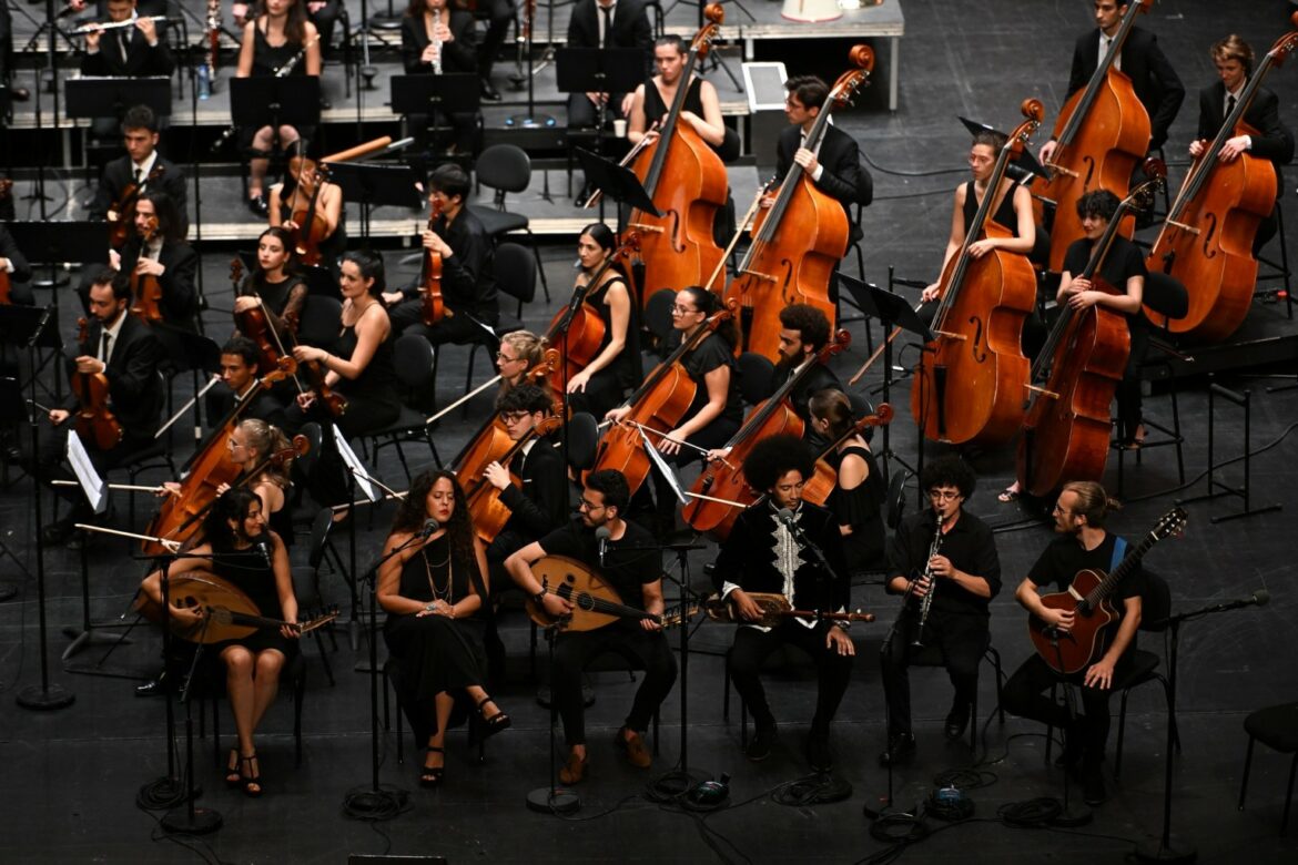 En revanche, la Création collective, présentée par le chef comme « L’Odyssée vue sous le regard de deux Pénélope », est une belle fusion de l’orchestre avec un sextuor de jeunes musiciens/musiciennes traditionnels, venues de la culture orale (programme Medina du Festival d’Aix). Créée par Fabrizio Cassol, Duncan Ward et l’arrangeur Matteo Nicolin, cette création procède par sections semi improvisées, parcourant une Odyssée sonore tour à tour implorante, véhémente ou pétulante. L’attrait est de faire pénétrer l’auditoire dans les cultures méditerranéennes par l’apport traditionnel des six solistes : Jawa Mania, syrienne (chant, oud), Fabiana Manfredi, italienne (chant), Islem Jemaï, tunisien (chant, oud), Omar Abadji, marocain (chant, guembri), Panogiotis Lazaridis, grec (clarinette). L’orchestre assure le lien entre les sections, pulsées par des riff de Brass band à la manière anglo-saxonne. Une pièce jubilatoire dans laquelle 110 jeunes s’investissent corps et âmes, faisant dialoguer les musiques de transmission orale et écrite.