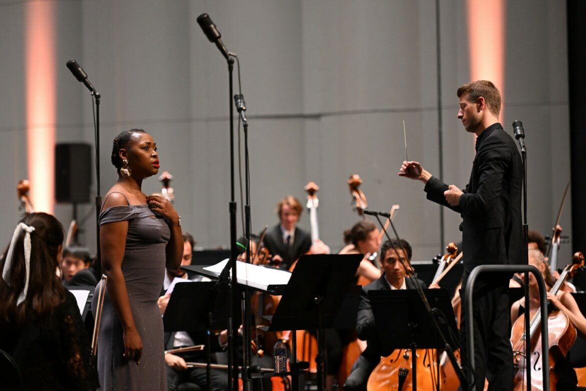 Poursuivant la tentative hispanique d’unir musiques traditionnelle et savante (Manuel de Falla), Xavier Montsalvage (1912-2002) s’imprègne, lui, des musiques cubaines dans les Cinco Canciones Negras. Tournant le dos au colonialisme, le compositeur catalan adapte ici des poètes espagnol (Rafael Alberti), uruguayen (I. Pereda Valdés) et cubain (Nicolas Guillen) sur le thème de la négritude. La sensualité des habaneras et rumbas trouve l’idéale interprète dans la personnalité de la mezzo gabonaise Adriana Bignagni Lesca, 1er Prix du Concours des voix lyriques d’Afrique 2022[1]. Tour à tour langoureuse, espiègle, danseuse ou maternelle (la berceuse), l’artiste fait miroiter les facettes d’un timbre d’une incomparable richesse harmonique (un avant-goût de celui de Grace Bumbry). Et sa sûreté musicale fédère autour de son chant les jeunes de l’Orchestre dans les détours colorés de la partition.