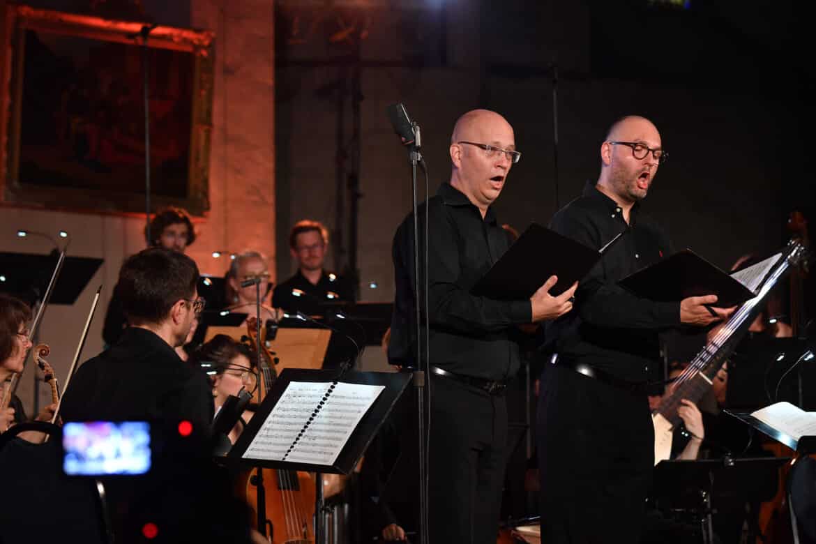 La souplesse de If Ye Love Me de Thomas Tallis précède celle du Laudibus in Sanctus (5 voix), signé par son disciple, William Byrd. Les configurations variées – chœur mixte avec instruments, chœur a cappella – tamisent cette musique anglicane, sobrement expressive. Dans la sélection des pièces d’Henry Purcell, la belle Ode à Sainte-Cécile, “Welcome to All the Pleasures” (1683), fleurit dans cette idéale acoustique. Si les deux volets de son ouverture instrumentale captivent déjà l’attention (excellent continuo et orgue positif de l’ensemble Les Ombres), les chœurs et soli résonnent avec bonheur dans l’emplacement « stéréophonique » des chanteurs-chanteuses entre jardin et cour, conduits par Joël Suhubiette, chef et fondateur des Eléments (1997). Parmi les solistes, signalons le talent du ténor François-Olivier Jean, du contreténor Gabriel Jubelin (dont les noms ne figurent hélas pas sur le succinct programme), s’adaptant aux tempi de danse (Mask) ou brodant sur le ground (basse contrainte) du continuo.