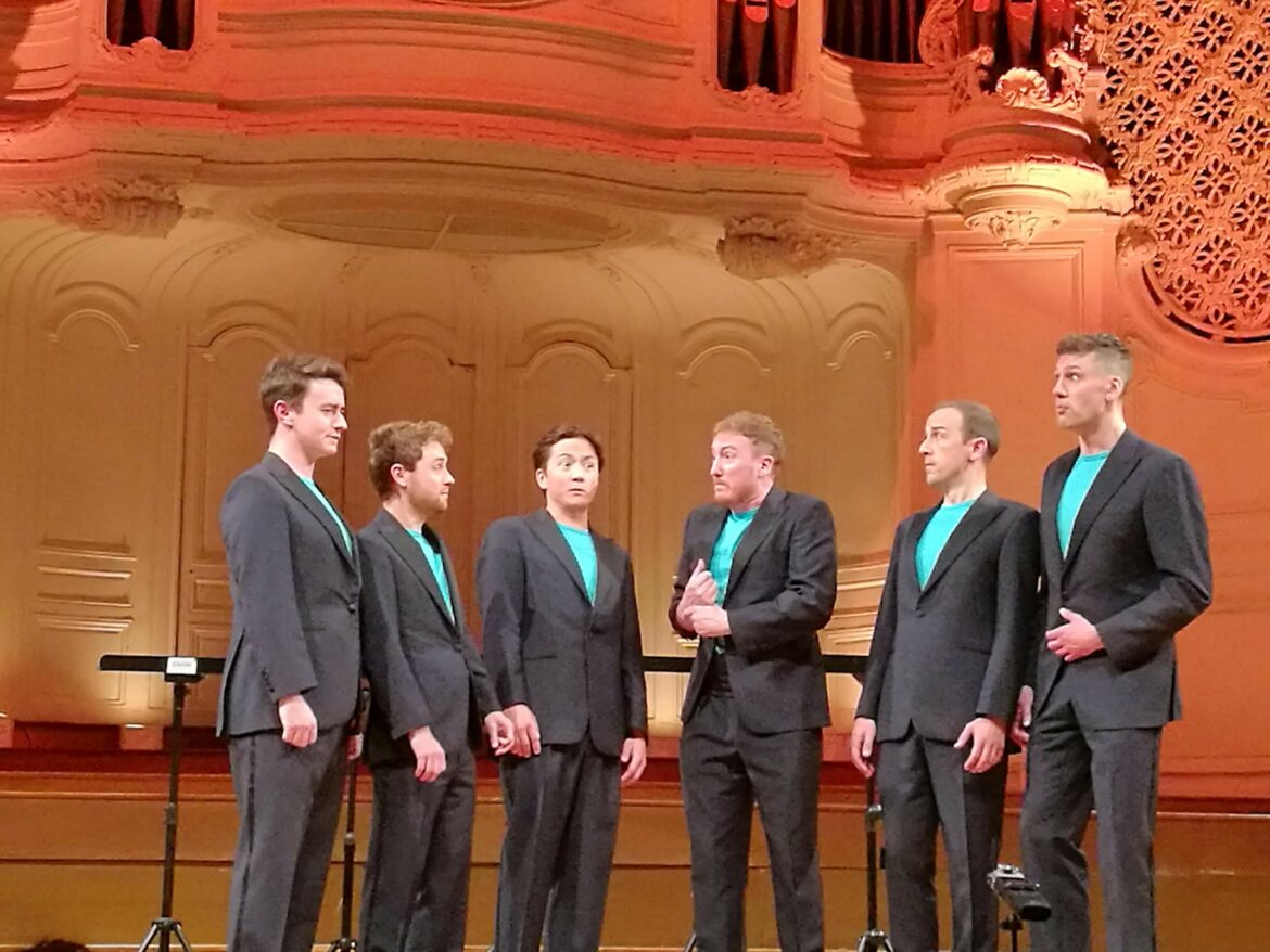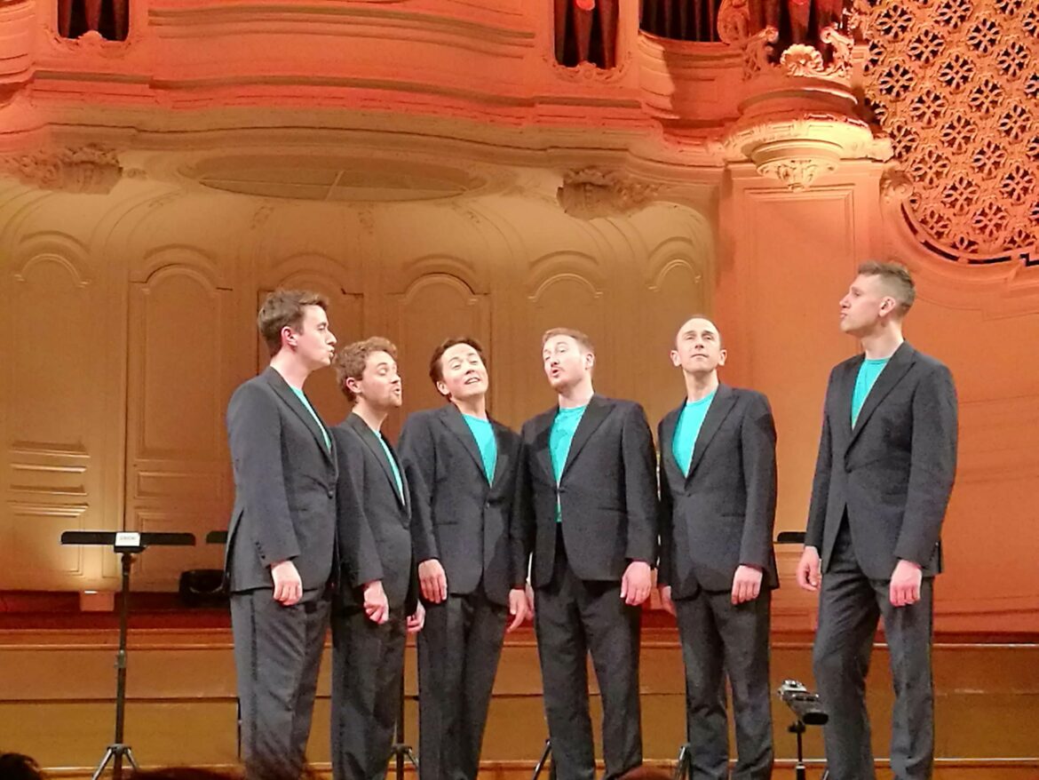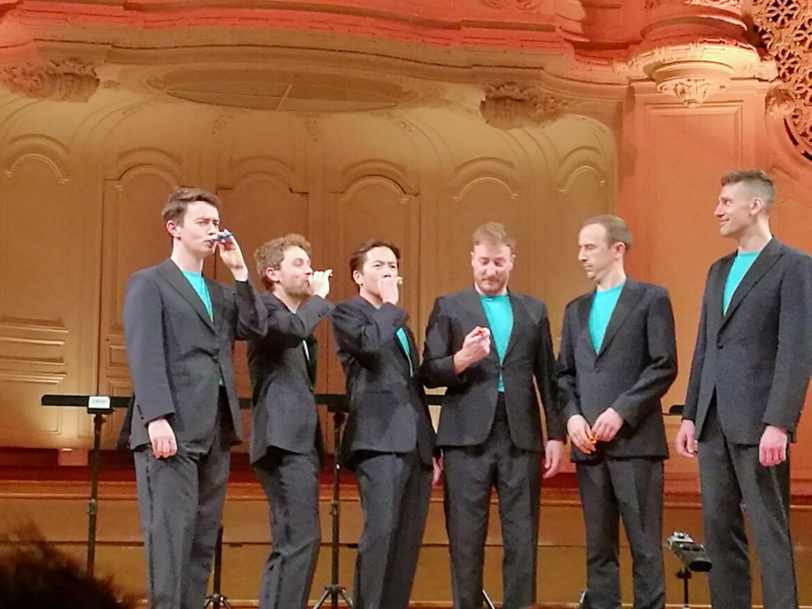 Les dimensions de la Salle Gaveau sont idéales pour ce type de spectacle, la distance réduite entre le public et le plateau permettant de créer une belle intimité. Aussi les King’s singers ne se contentent-ils pas de chanter : ils s’adressent directement aux spectateurs et prennent la parole les uns après les autres (dans un français excellent, assaisonné d’un irrésistible accent british, plus ou moins prononcé en fonction des chanteurs) pour donner des explications sur les morceaux qui seront interprétés. Le concert est un régal, et suscite une admiration qui ne faiblira pas jusqu’à l’ultime bis ! Saluons l’extraordinaire précision rythmique, l’incroyable justesse des attaques, la complicité de tous les instants qui unit les six chanteurs, visiblement ravis de se produire salle Gaveau, et de s’y produire ensemble ; la façon dont les couleurs de chaque timbre se fondent entre elles pour former une pâte sonore d’une parfaite harmonie, l’art avec lequel les voix tantôt se superposent, tantôt se répondent, la ligne de chant passant parfois d’un soliste à l’autre, mettant occasionnellement en valeur une voix après l’autre, sans que jamais l’équilibre ne soit rompu, sans qu’aucun chanteur prenne jamais le pas sur ses partenaires. Mais il faut aussi louer la parfaite aisance des chanteurs et leur incroyable versatilité stylistique, chacun d’entre eux se montrant tout aussi à l’aise dans la gravité que dans la fantaisie, dans les pièces sacrées de la Renaissance que dans les morceaux plus contemporains. Enfin, le concert n’aurait pas le même sel sans l’humour qui parcourt toute la soirée, humour des textes (Cuckoo in the pear-tree ou A long sad tale de Ligeti, Five ways to kill a man de Bob Chilcott), mais aussi des interprétations, émaillées de mimiques, de bruitages, d’imitations de certains instruments…