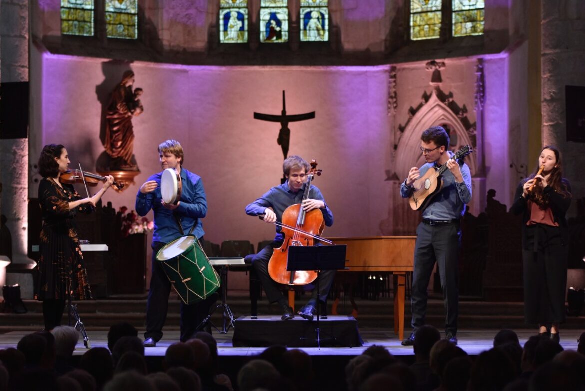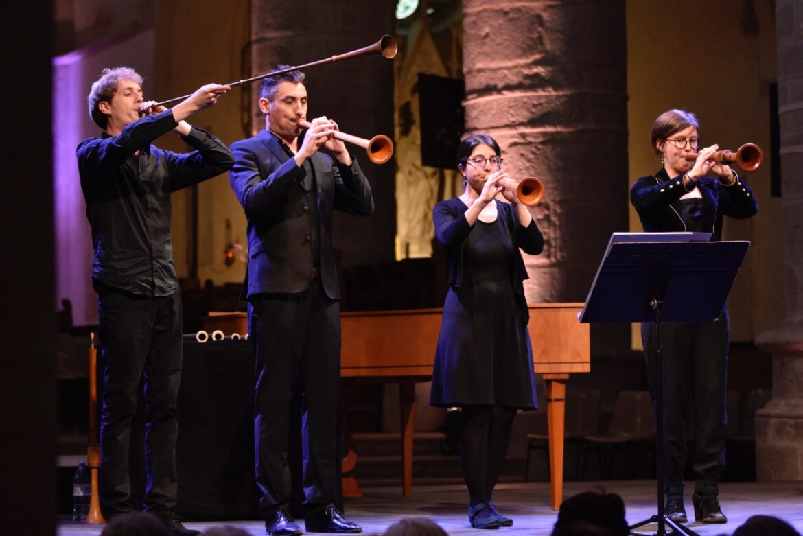 Issues de la sélection EEEmerging +, deux autres formations transportent les publics aux XVe et XVIe siècles, dans l’abbatiale. Elles portent une dimension spectaculaire qu’autorise la thématique de cette 43e édition « musiques en jeux ». Into the Winds (déjà remarqué en 2021) entremêle des textes de chroniqueur de la Guerre de Cent ans (ou du sacre de Charles VI) aux sonneries triomphantes. À la verdeur des anches – chalemie, bombarde – répond le jeu nuancé de la busine (trompette de plus de 2 m) sous les roulements de timbales médiévales, ou bien l’entrain du galoubet. Venu d’Allemagne, l’ensemble I Zefirelli mise davantage sur l’interactivité avec le public. Sans partition, les 5 talentueux musicien.nes restituent une sorte de fête renaissante à la taverne (au pub ?), au fil de danses folkloriques irlandaises (flûtiste virtuose de Luise Catenhusen) et anglaises. Leur juvénile ardeur est communicative, tandis que le tenorino du percussionniste (Jeroen Finke) fait mouche dans la chanson avec un humour qui enchante le public.