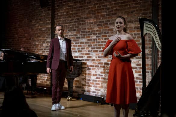 Même si les lecteurs de Première Loge attendent vraisemblablement plus d’informations sur les voix, il n’est pas déplacé de commencer par quelques mots sur les instrumentistes réunis pour l’occasion. La harpe n’est pas si souvent présente dans les concerts de l’Adami : cette lacune est comblée grâce à Mélanie Laurent, dont la carrière semble d’ores-et-déjà bien décollée, qui ouvre la soirée avec Une châtelaine en sa tour de Fauré, puis reparaît en tant qu’accompagnatrice dans un superbe Andante mosso des Trois Mélodies russes de Glinka. Elle a alors pour partenaire la violoniste Magdalena Sypniewski et le violoncelliste Johannes Gray, qui reviennent ensuite en solistes, l’une pour une brillante Tarentelle de Wieniawski, l’autre pour un ébouriffant Pezzo capriccioso de Tchaïkovski. Violon et violoncelle concluront le concert dans le Scherzo du Trio n°1 de Mendelssohn, cher aux auditeurs du Masque et la plume sur France Inter, le troisième pilier étant alors le pianiste Samuel Bismut, qui avait précédemment offert une belle exécution de l’Alborada del gracioso.