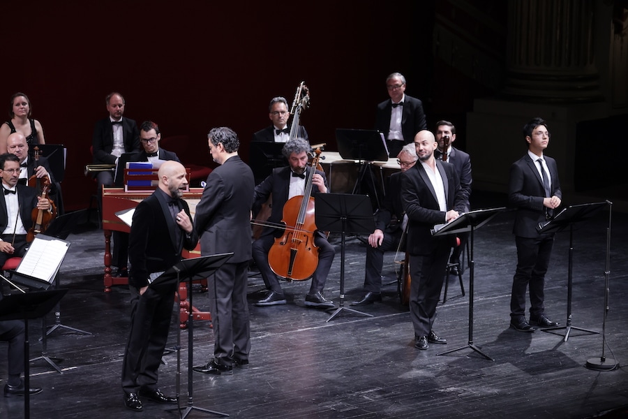 L’absence de mise en scène n’aide pas à faire oublier la faible cohérence de l’histoire ni à rendre crédible la conversion soudaine de Lottario, et l’opéra devient une suite de belles arias reliées par des récitatifs secs. Les numéros musicaux des solistes démontrent la particularité de l’écriture de Porpora qui, dans ses opéras, se révèle un compositeur expert mais surtout un maître du chant : dans son élégance et son efficacité, le rôle de l’orchestre est surtout celui d’un accompagnateur de la voix, où les arias suivent une structure rigide : la première section consiste en une brève introduction orchestrale, suivie d’un premier épisode vocal se terminant à la dominante, d’un court refrain orchestral, d’un deuxième épisode vocal varié et modulé à la tonique, et d’un refrain final ; la deuxième section est beaucoup plus courte, avec un tempo et un caractère différents, tandis que le da capo reprend la première partie avec des variations luxuriantes et une cadence finale. Cette structure tripartite, ou plutôt pentapartite (A, A’, B, A », A »‘) est illustrée dans l’aria qui conclut le premier acte, où Adalgiso exprime ses craintes en utilisant une métaphore maritime très fréquente dans l’opéra baroque : « Saggio nocchier che vede […] la speme naufragar« , un morceau dans lequel la vedette de la soirée, Franco Fagioli, brille dans un tourbillon d’agilité et de virtuosité vocale : Trilles extrêmement longs, sauts de registre vertigineux, aigus stratosphériques et notes caverneuses, passages legato et staccato, tout un échantillonnage de prouesses vocales que le contre-ténor argentin aborde et résout avec une souplesse désarmante et un goût du spectacle qui rappelle les figures mythiques des evirati cantori (chanteurs émasculés) du XVIIIe siècle dont Fagioli est aujourd’hui le représentant incontesté et insurpassable. Cet air rappelle une autre de ses interprétations mythiques, celle de « Vo solcando un mar crudele » (encore une métaphore maritime…) de l’Artaserse de Vinci, œuvre présentée huit ans plus tôt dans ce même Teatro delle Dame et dont Porpora cite un passage orchestral. Le même Adalgiso/Fagioli est également chargé de conclure le deuxième acte avec l’air « Spesso di nubi cinto […] s’asconde il sole in mar » conclu par une cadence retentissante. Malheureusement, le choix de la Scala d’un seul entracte au milieu de l’acte II diminue quelque peu l’effet qu’il a sur la scène en tant que finale de l’acte. Avec « Taci, oh Dio ! ch’è da tiranno | il rapir con frode un regno« , Fagioli fait entendre une étonnante messa di voce et des sons filés interminables. Il est dommage que l’air de l’acte III d’Adalgiso « Con placido contento » soit coupé, mais l’expressivité dont la vocaliste Fagioli sait faire preuve se retrouve dans le duo lyrique avec Gildippe « Dimmi che m’ami, o cara« , un numéro d’une beauté insolite où les cadences mettent également en valeur l’autre vedette de la soirée, Julija Ležneva.