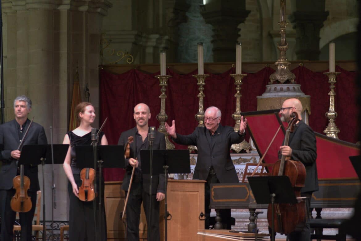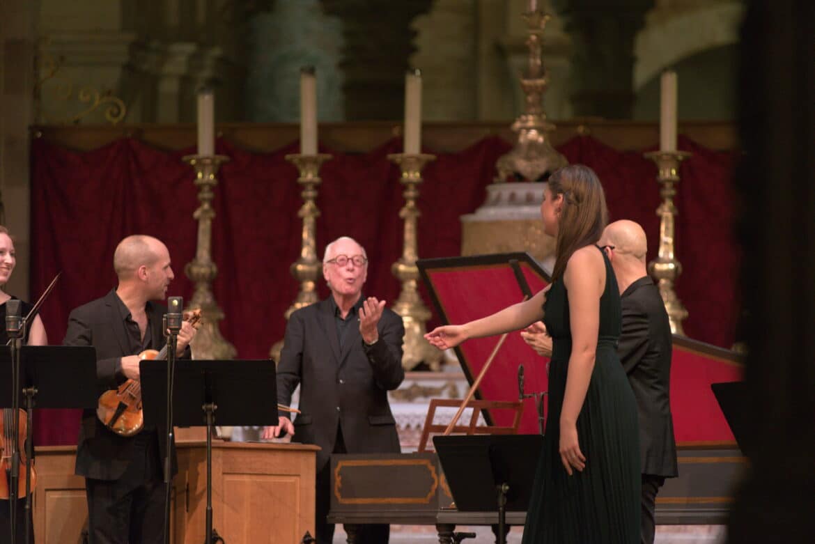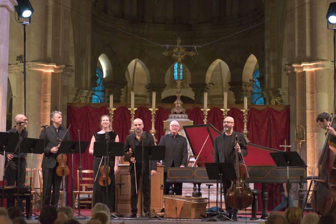 Le Festival de Beaune s’appuie sur des collaborations fidèles. William Christie y est présent depuis 1985. Souvent, il met en avant des lauréats de son festival Jardin des Voix, qui a lieu dans sa maison de Vendée : pour la présente édition, ce sont Helen Charlston (Didon) et Renato Dolcini (Énée). Les conditions acoustiques de la Basilique sont bien entendu différentes de la cour des Hospices, mais toujours aussi bonnes ; d’où nous nous trouvons (au centre), la Basilique empêche la vue sur ses collatéraux mais des écrans ont été installés. Le public remplit intégralement l’église, après avoir littéralement submergé les cafés et restaurants alentours : c’est dire le succès de ce festival. William Christie est au clavecin, en retrait, mais on l’aperçoit bien qui écoute paisiblement derrière ses lunettes rondes ! Le reste du continuo est à droite, avec une contrebasse et un violoncelle – le seul en tee-shirt noir, musicien inspiré, notamment lors d’un interlude en solo. À gauche, les trois violons sont flanqués d’une flûte (prenant le piccolo) et d’un hautbois baroque (sans clef, prenant une flûte), s’amusant également à proférer des cris de démons quand il le faut. Ces bois, tout comme les cordes, produisent des effets d’écho ou semblent écraser l’archet lors de la scène de l’orage avec les sorcières – mais évitent les clusters contemporains que s’est permis l’orchestre de Spinosi la veille dans L’Olimpiade de Vivaldi. Devant, les chanteurs et le chœur sont efficacement mis en espace par Sophie Daneman, rendant ce concert vivant et l’action compréhensible.
