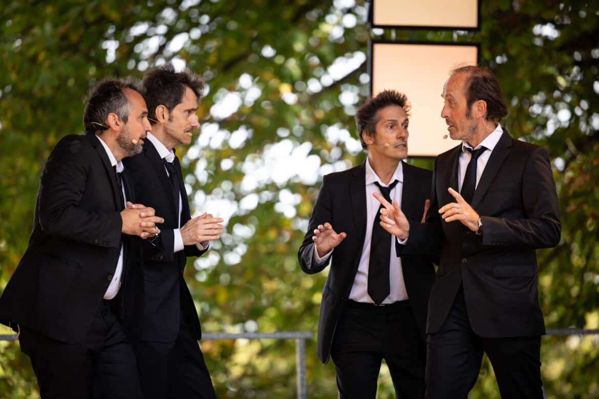 Le soleil étant revenu sur la colline de Vézelay, le concert apéritif du vendredi 25 août a réuni une foule nombreuse sur la terrasse de la basilique à partir de midi pour écouter les Têtes de Chien, une formation de quatre artistes venus tout à la fois de la variété, du théâtre et de l’opéra pour réinterpréter a capella dans de savantes polyphonies les titres intemporels du répertoire populaire français. Le principe du concert aux chapeaux est simple : les Têtes de Chien ont inscrit sur des papiers l’ensemble des titres de leur répertoire et les ont classés dans cinq couvre-chefs : un borsalino rose pour les chansons licencieuses, un chapeau vert pour les faits-divers, un casque de chantier pour les mélodies revendicatrices, etc. Les spectateurs ne savent donc pas ce qu’ils vont entendre et les artistes découvrent ce qu’ils vont chanter parmi les millions de combinaisons possibles de ce tirage-au-sort aléatoire.