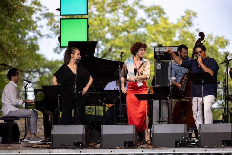 Entouré de son père Pancho Gonzalez, de deux chanteuses et de quelques instrumentistes (piano, trompette, contrebasse et percussions), Emiliano Gonzales Toro esquisse en une dizaine de titres le portrait d’une chanteuse populaire qui a collecté au gré de ses voyages de nombreux titres du folklore traditionnel chilien et qui s’est même essayé à l’écriture en français au cours de son long séjour parisien en 1961-1964. Le timbre velouté et le chant legato du ténor font merveille dans ce répertoire dont on retiendra principalement les titres « La jardinera », « Une Chilienne à Paris » qui retrace avec beaucoup d’humour l’arrivée de Violeta Parra en France et « Gracias a la vida » qui offre l’occasion à chaque musicien de montrer sa virtuosité et de vibrer au timbre solaire de la chanteuse Paloma Pradal. Ce dernier titre, interprété sous un ciel obscurci et accompagné des roulements du tonnerre, a conquis le public et valu aux artistes une standing ovation.