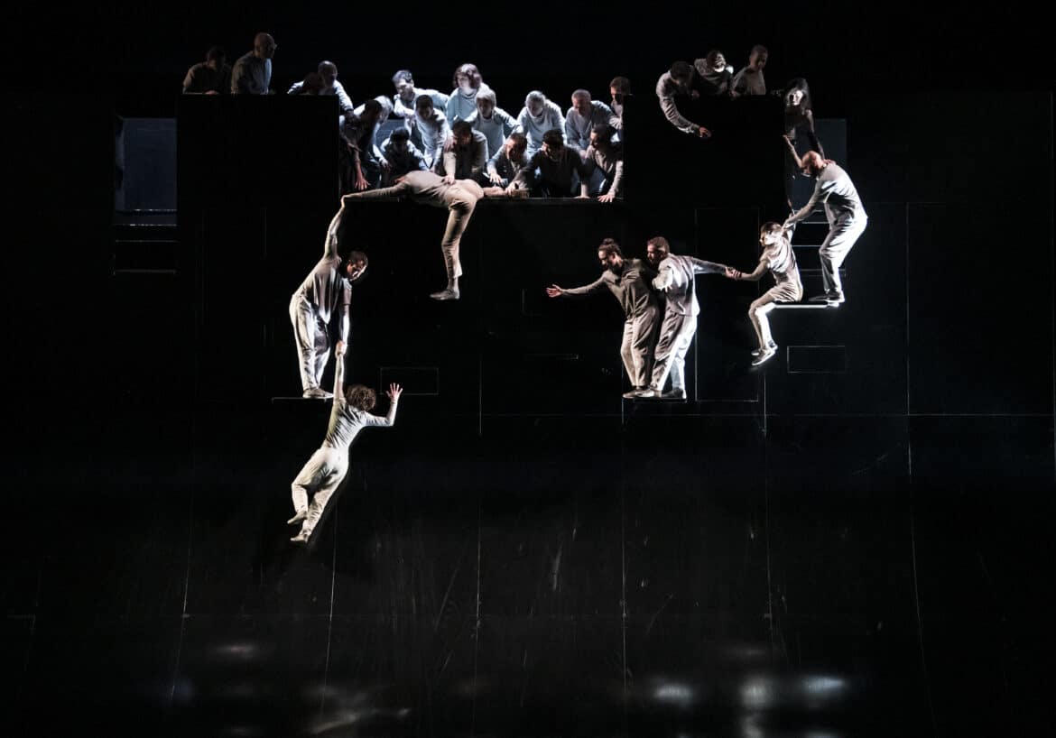 Et puis il y a ces corps qui tombent, disparaissent, grâce à un ingénieux système de cyclo horizontal permettant de glisser en douceur, indéfiniment, jusqu’à retourner dans les limbes. Ce sont autant d’inventions rendues possible par l’ingéniosité du dispositif, le plateau circulaire animé ainsi que la multiplicité des combinaisons de fabuleux danseurs – parfois amenées à se répéter.