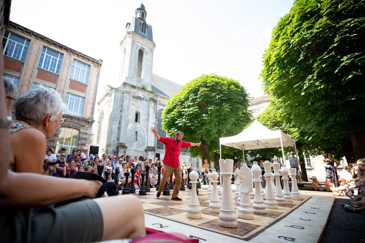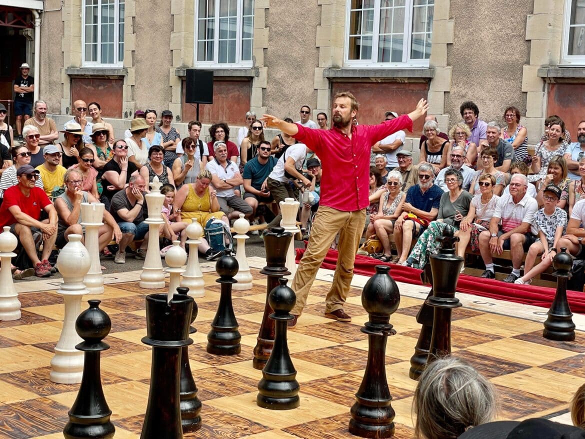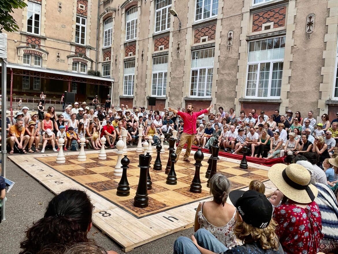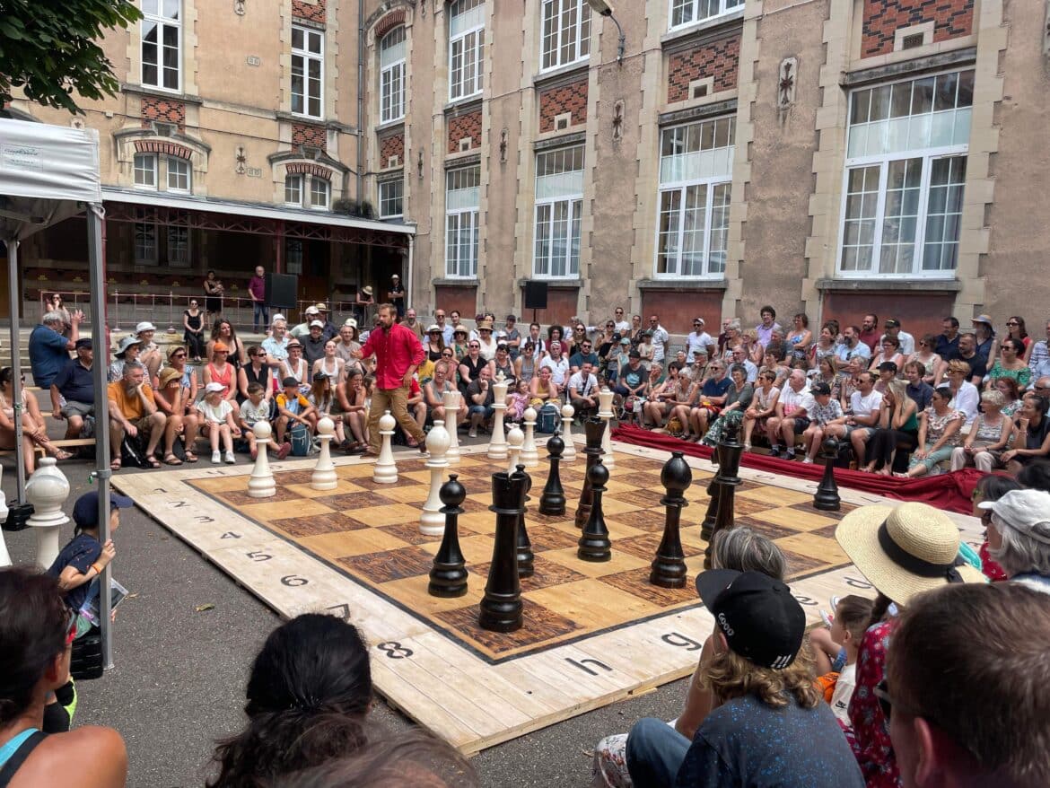 Il n’est pas certain que la centaine de spectateurs qui prend place sur les gradins de pin Douglas disposés autour du praticable en forme d’échiquier, au centre de la cour du collège Buvignier, sache bien à quel genre de spectacle elle vient assister : jeunes enfants, adolescents, enseignants en retraite (ou pas) et parents soucieux d’occuper leurs marmots en les détachant de leurs écrans le temps d’une heure au moins, forment une foule hétérogène à la sociologie mélangée mais réunie par l’envie de partager tous ensemble l’expérience authentique du spectacle vivant.