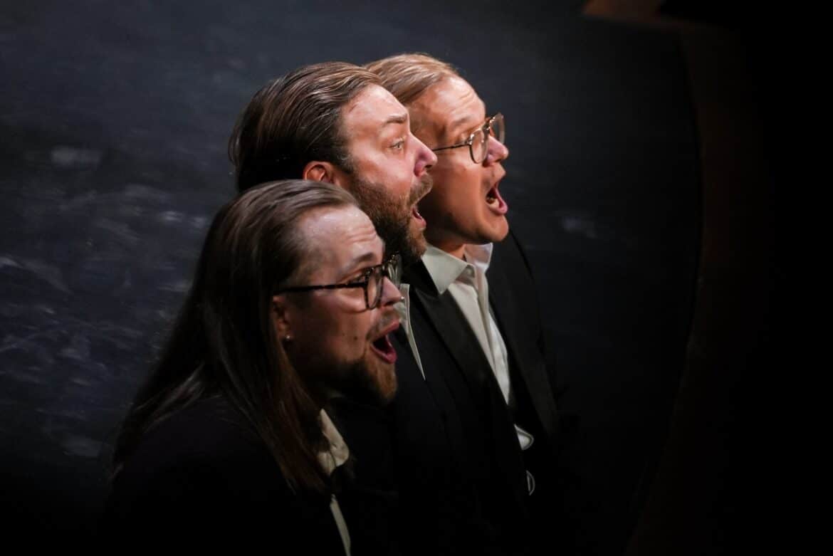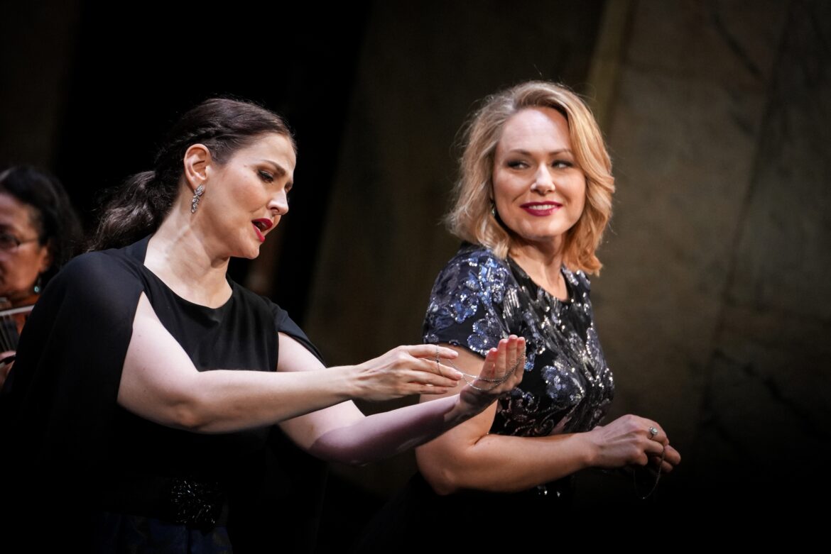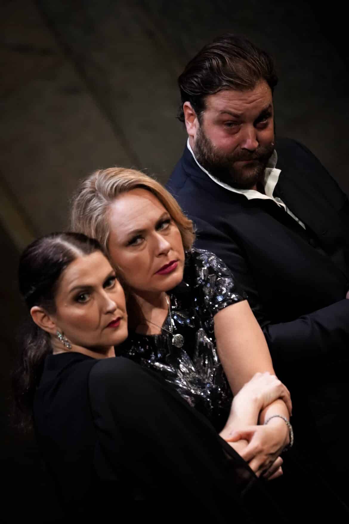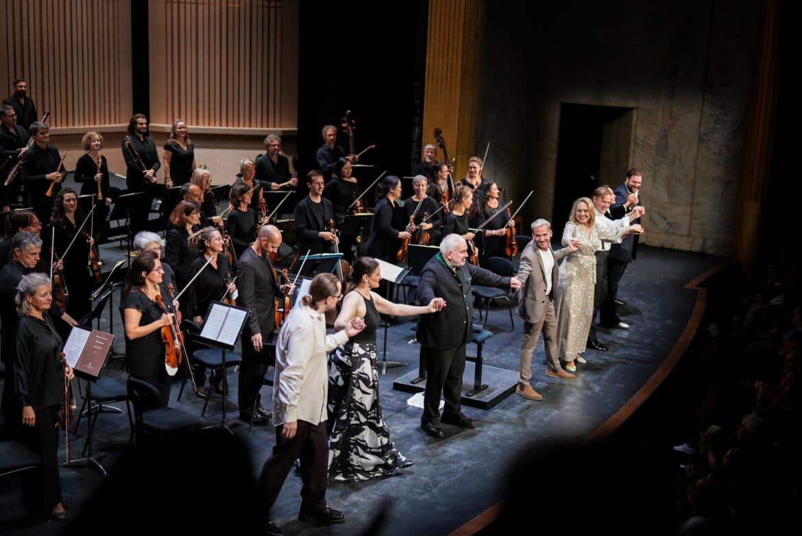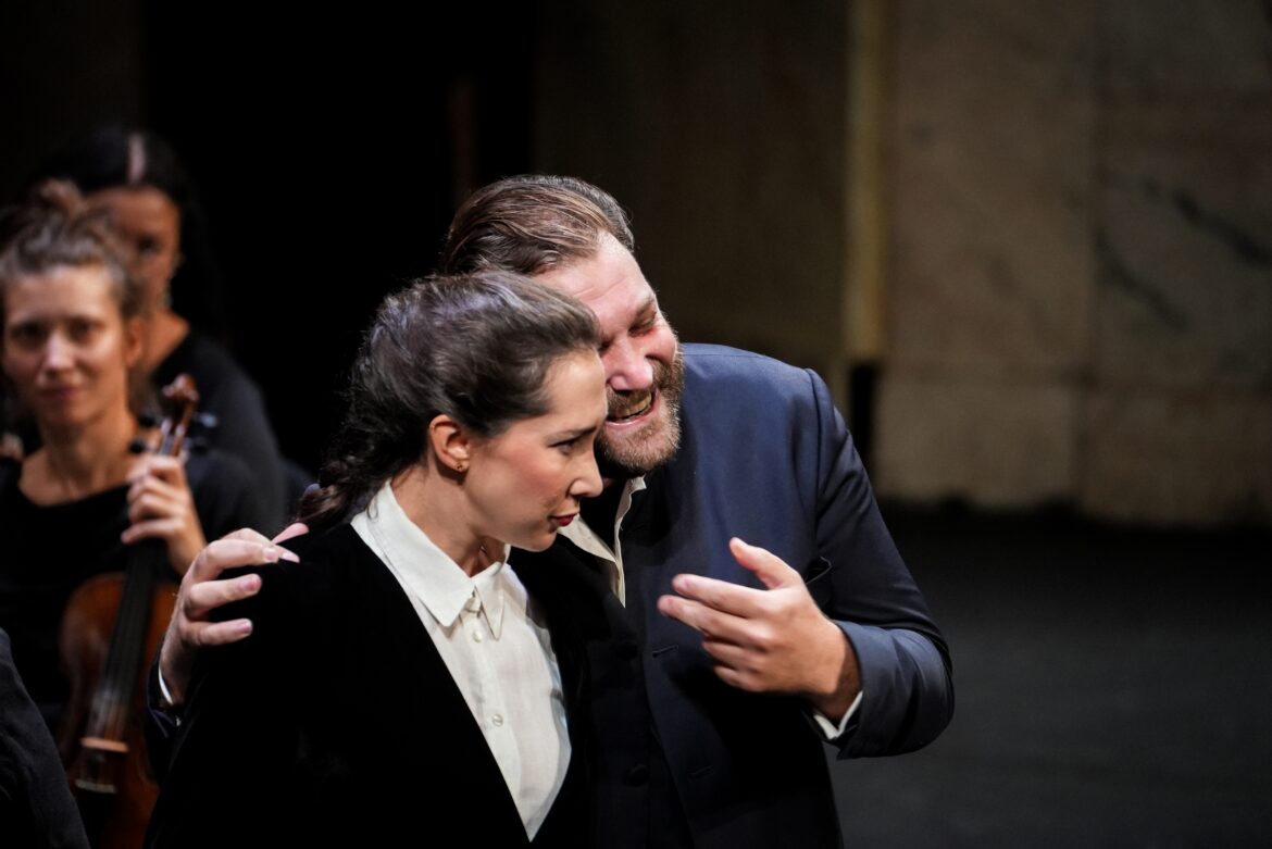 Le public retrouve ce soir l’équipe artistique de la version scénique au quasi-complet (à l’exception de Leon Košavić qui remplace Florian Sempey). La partition connue par cœur par chacun ouvre la voie à une légère mise en espace. Les chanteurs investissent le plateau du bord au fond de scène, interagissent avec les musiciens et le chef avec parcimonie, etc. L’ensemble se réduit aux besoins de l’intrigue, et cela fonctionne très bien. Stimulés par l’expérience de la production scénique passée, les chanteurs se fondent avec beaucoup de naturel dans cet espace restreint pour offrir un jeu scénique généreux qui en ferait presque oublier qu’il s’agit ici d’une version de concert.
