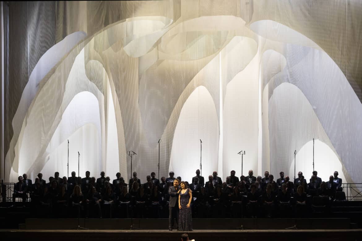 Reposant essentiellement sur la présence d’une structure scénographique volumineuse d’Alcantara – que l’on pourrait assimiler à un barnum de quelque…700 m2 venant envelopper toute la superficie du plateau -, la mise en espace de Kengo Kuma, évoquant à l’occasion vagues, volutes et éléments maritimes, se limite principalement à un habillage de la scène, faisant de cette dernière un protagoniste central du drame où le chœur – à l’antique ! – suit et commente l’action depuis la partie supérieure du plateau et où les personnages s’affrontent sur la partie inférieure. Placé en fosse, l’orchestre laisse le champ libre à la parfaite visibilité des mouvements scéniques par le spectateur. Si les lumières préparées par l’éclairagiste Filippo Cannata mettent souvent en évidence les clairs/obscurs d’une partition qui en est friande, il nous a personnellement manqué, justement, la couleur marine pourtant centrale ici.