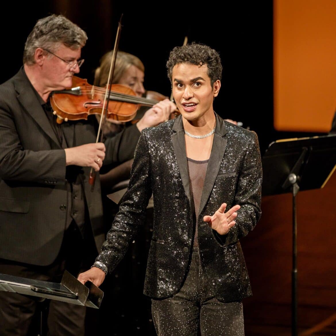Ce vendredi, il a suffi que Samuel Mariño s’approche d’un pas hésitant du bord de la scène du Grand Théâtre pour que le concert Agitata prenne soudain une autre dimension. Fragile silhouette habillée de strass et de paillettes, le micro tremblant au creux de sa main, le contre-ténor vénézuélien s’adresse au public d’une voix blanche pour évoquer la journée mondiale de la santé mentale.