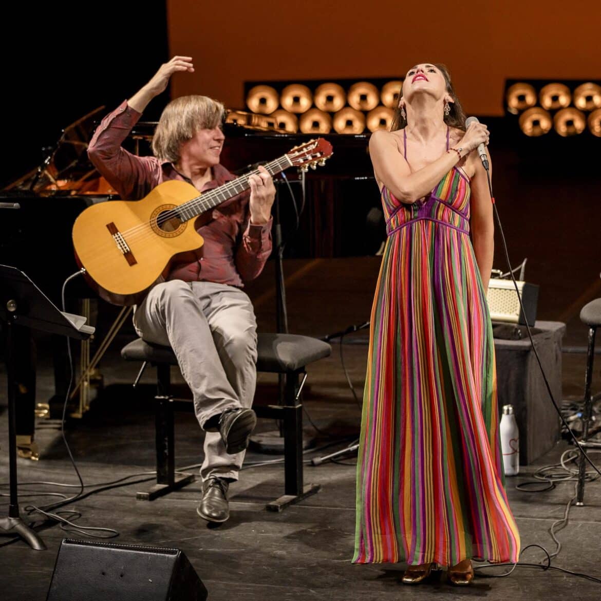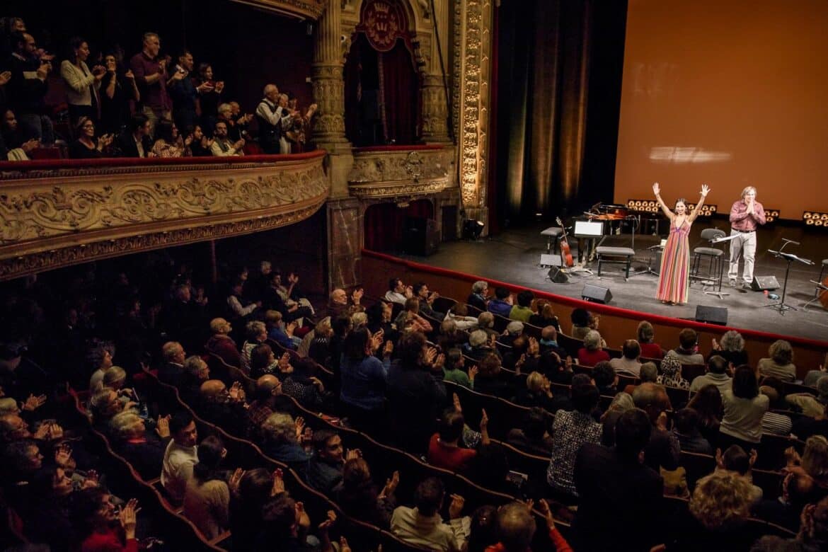 Pour ce tour de chant à l’ancienne, Mariana Flores a donc laissé au vestiaire la panoplie de la diva : sur un plateau presque nu, elle apparait en robe bain de soleil aux couleurs automnales, un micro filaire au creux de la main, comme au bon vieux temps des shows télévisés de Maritie et Gilbert Carpentier. Le concert a beau être sonorisé, la richesse du timbre et le grain de voix de l’artiste sont remarquablement respectés et on a tôt fait d’oublier qu’elle est d’abord une chanteuse lyrique pour ne plus voir sur scène qu’une artiste attachée à défendre un répertoire qui coule dans ses veines depuis l’enfance.