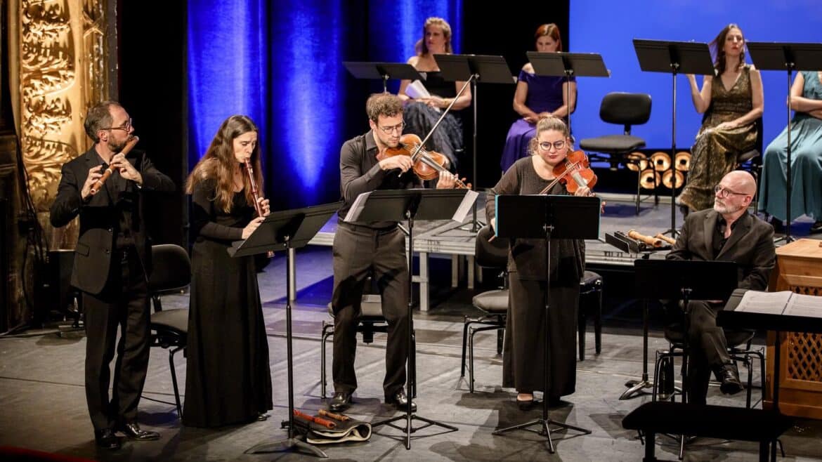 Si la salle du Grand Théâtre de Tours est incontestablement plus vaste que le salon de Mlle de Guise dont la résidence parisienne s’élevait au Grand Siècle à l’emplacement de l’actuel hôtel de Soubise, rue des Francs-Bourgeois, dans le Marais, ce n’est en rien un handicap pour les musiciens de l’Ensemble Jacques Moderne dont les sonorités capiteuses emplissent le théâtre dès les premiers accords de l’ouverture. La ritournelle qui ouvre le drame d’Orphée est d’ailleurs immédiatement l’occasion d’apprécier des cordes primesautières sans être astringentes, ainsi qu’un solide et majestueux continuo, les flutes délurées de Marine Sablonnière et Matthieu Bertaud pimentant délicieusement la simplicité du dispositif.