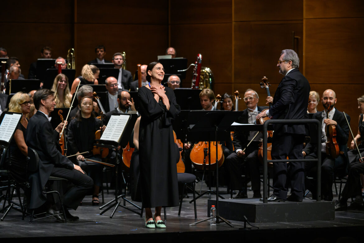 Ce n’était pas la première fois que nous avions la chance d’entendre Asmik Grigorian dans Les Quatre derniers lieder. Disons-le tout net : il nous a manqué dans les deux premiers opus, « Frühling » et « September », cette respiration de l’âme qui, sans aucun artifice, doit d’emblée ne faire qu’un avec l’orchestre. Sans doute, un effet secondaire de la soirée vocalement intense de la veille ? Si la projection garde la netteté de la lame, l’égalité du souffle ne sera finalement au rendez-vous que dans la somptueuse phrase finale de « September », bien préparée par le noble solo de cor qui la précède. C’est, pour nous, avec « Beim Schlafengehen » (Au moment d’aller dormir) que l’interprète entre véritablement en osmose avec la respiration de l’orchestre, qu’elle favorise même, sous-tendue ici par les phrases splendides du premier violon de Kai Gleusteen. Dans « Im Abendrot » (Dans la lueur du soir), le chant sur le souffle, bien retrouvé et toujours étonnant de maîtrise technique, vient s’unir à la section des vents, particulièrement sollicités ici, et nous laisse sur un bonheur musical accompli.