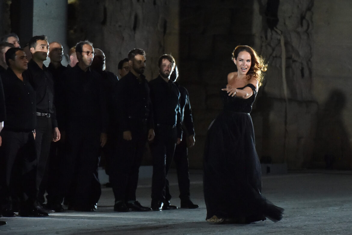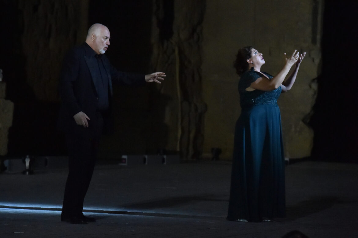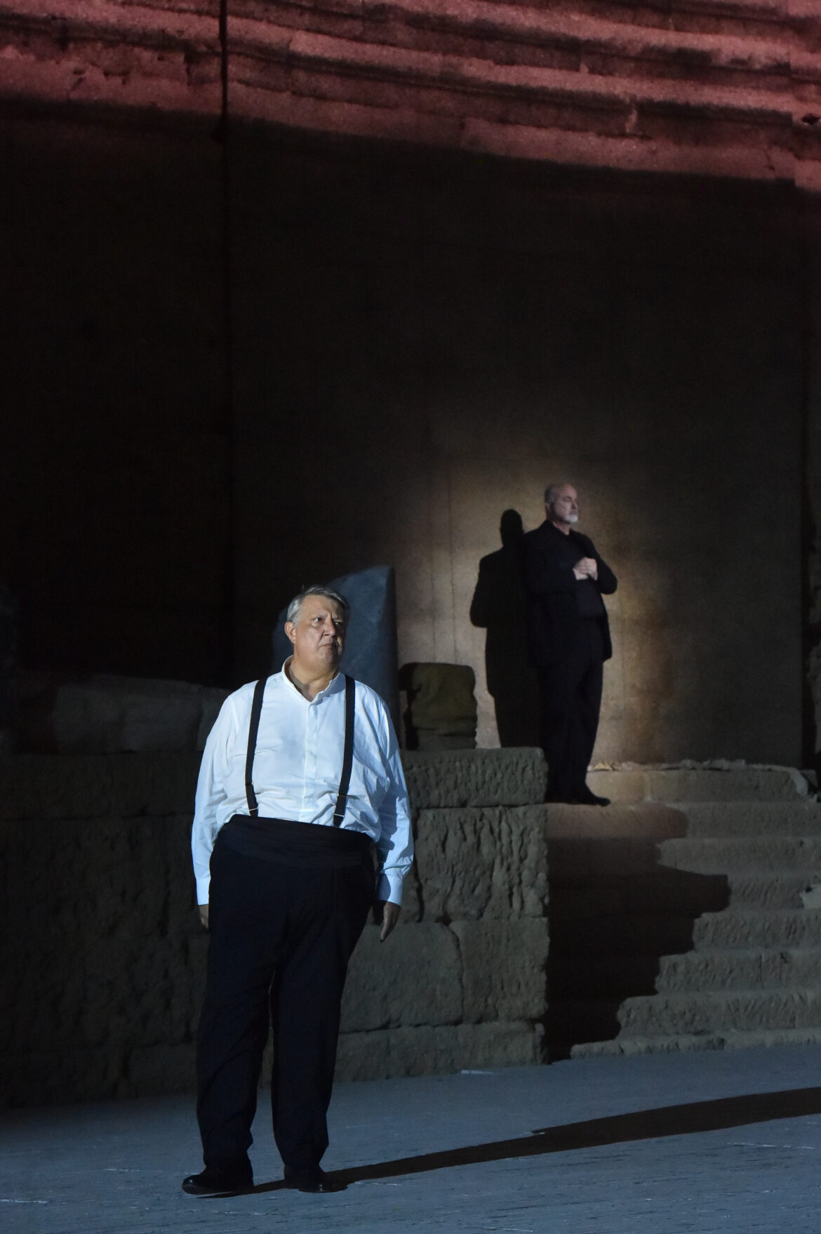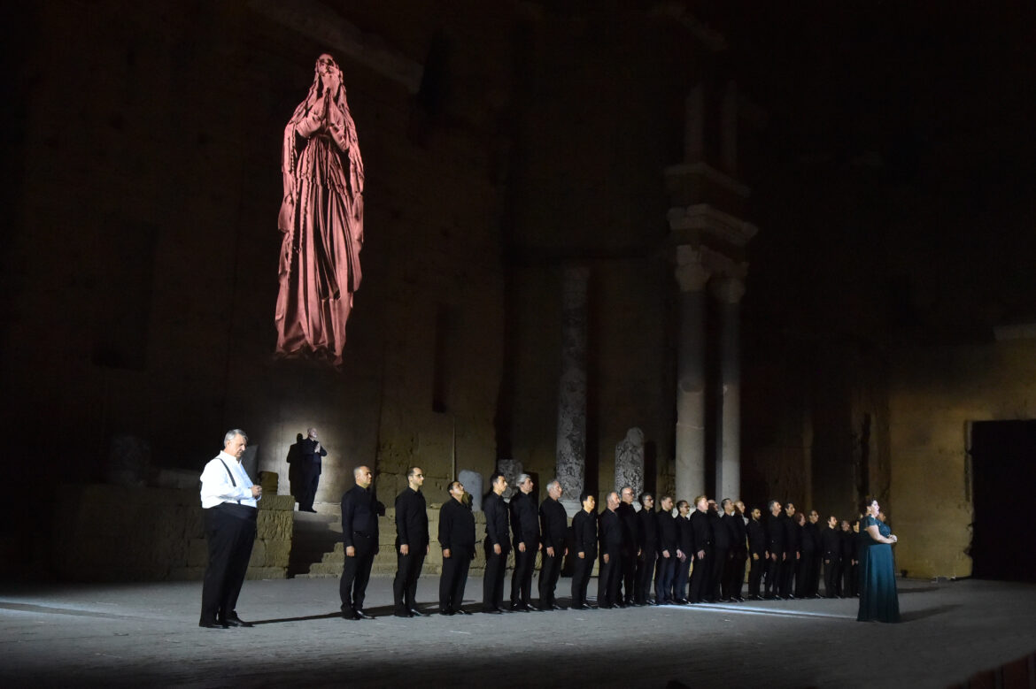 La soirée avait pourtant bien commencé : un excellent dîner à la Grotte d’Auguste qui donne sur le théâtre antique pour être à pied d’œuvre et ne rien manquer. Le temps, quoique couvert, se maintenait et la température était idéale, loin des grosses chaleurs des derniers jours. Le public nombreux prenait place sur les gradins, sortant, qui des coussins, qui des sièges en bois ou en carton. La statue monumentale d’Auguste semblait étendre sa protection sur la scène et la « fosse ». Bref, tout était pour le mieux et la représentation, bien qu’en version de concert, s’annonçait belle.