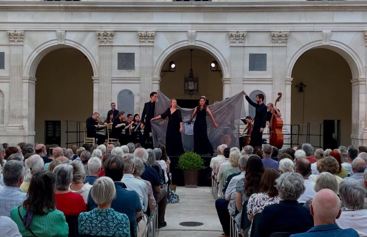 Sur le podium dressé au fond de la cour du château, Pygmalion est donné dans une version semi-scénique dont les tableaux ont été réglés par Thomas Condemine : un grand voile de tulle gris, quelques chaises et l’implication dramatique des solistes réussissent le miracle de donner à imaginer ce que pourrait être une production de cet acte de ballets avec décors et costumes.